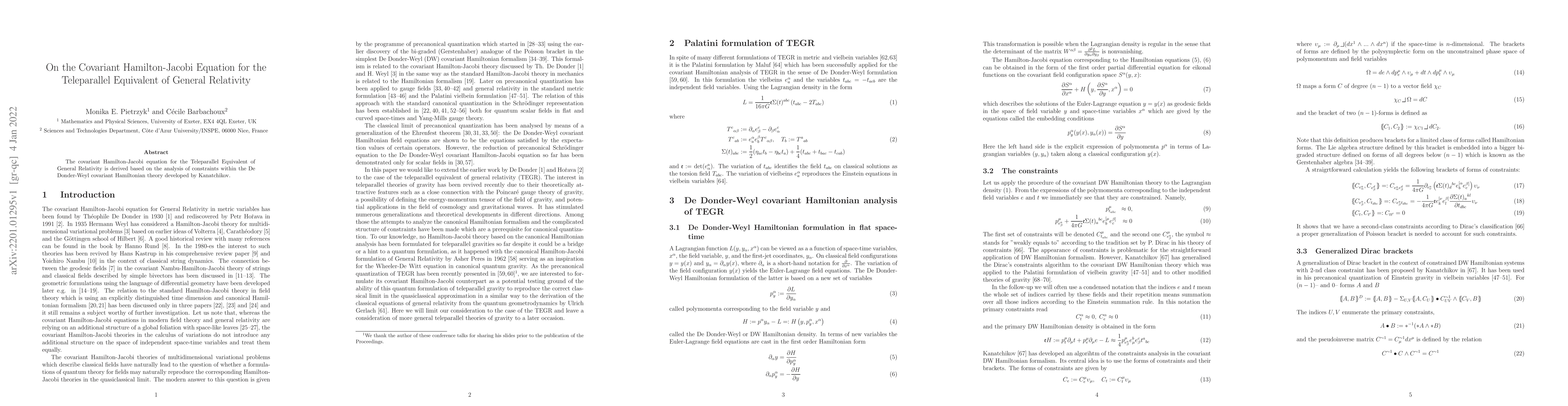 The covariant Hamilton-Jacobi equation for the Teleparallel Equivalent of General Relativity is derived based on the analysis of the second-class constraints within the covariant Hamiltonian theory of De Donder-Weyl according to the constraints algorithm developed by Kanatchikov.