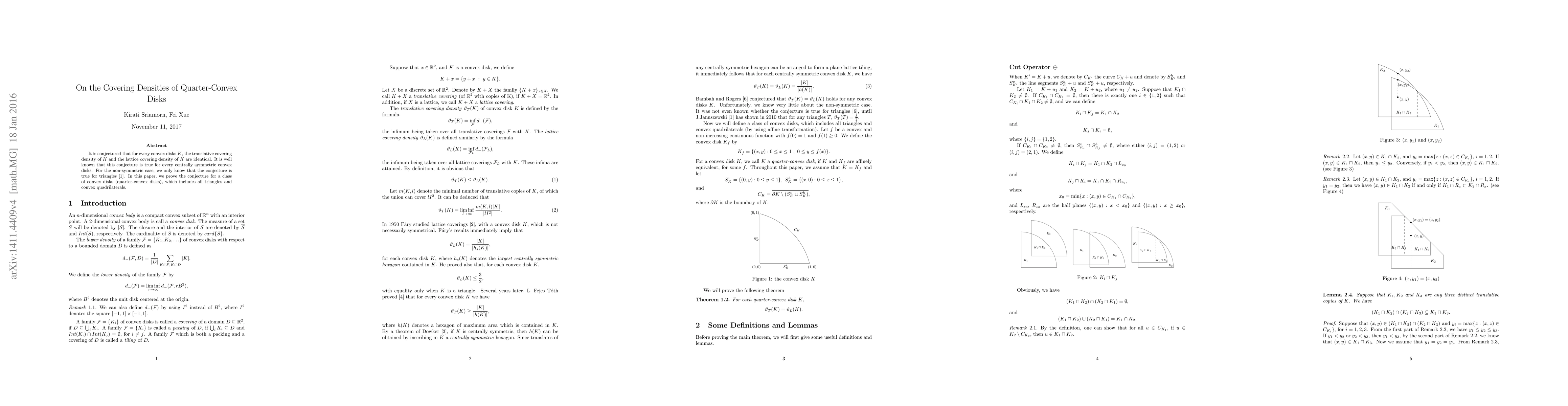 It is conjectured that for every convex disks K, the translative covering density of K and the lattice covering density of K are identical. It is well known that this conjecture is true for every centrally symmetric convex disks. For the non-symmetric case, we only know that the conjecture is true for triangles. In this paper, we prove the conjecture for a class of convex disks (quarter-convex disks), which includes all triangles and convex quadrilaterals.