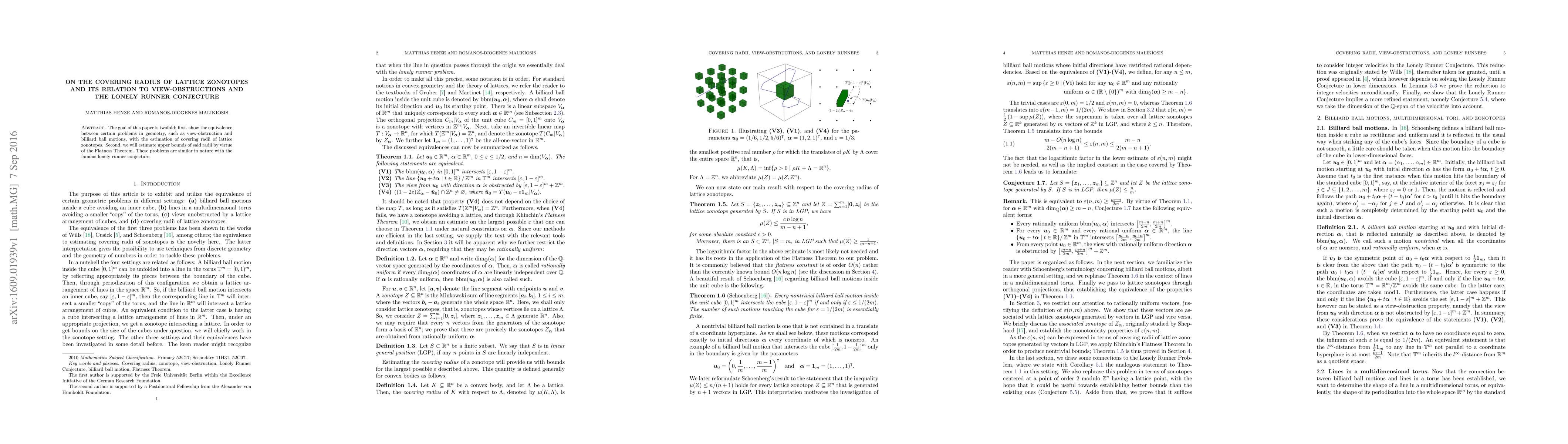 The goal of this paper is twofold; first, show the equivalence between certain problems in geometry, such as view-obstruction and billiard ball motions, with the estimation of covering radii of lattice zonotopes. Second, we will estimate upper bounds of said radii by virtue of the Flatness Theorem. These problems are similar in nature with the famous lonely runner conjecture.