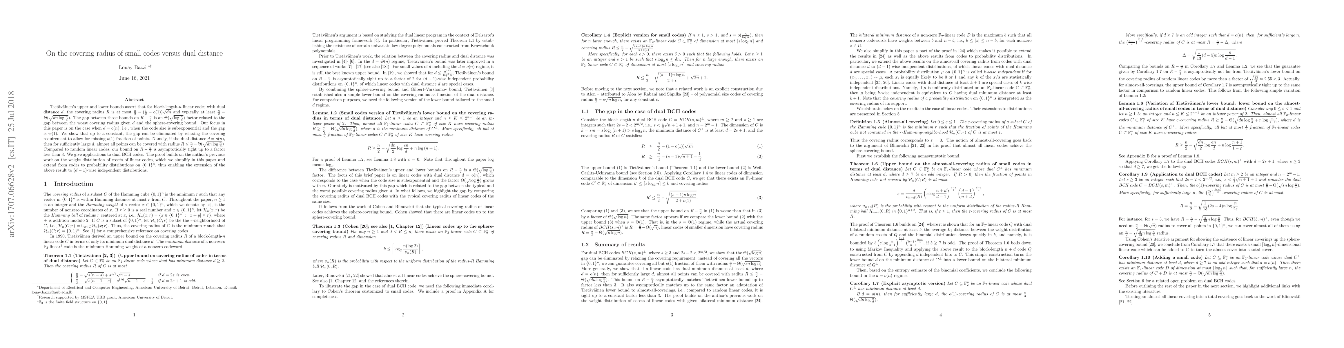 Tiet\"{a}v\"{a}inen's upper and lower bounds assert that for block-length-$n$ linear codes with dual distance $d$, the covering radius $R$ is at most $\frac{n}{2}-(\frac{1}{2}-o(1))\sqrt{dn}$ and typically at least $\frac{n}{2}-\Theta(\sqrt{dn\log{\frac{n}{d}}})$. The gap between those bounds on $R -\frac{n}{2}$ is an $\Theta(\sqrt{\log{\frac{n}{d}}})$ factor related to the gap between the worst covering radius given $d$ and the sphere-covering bound. Our focus in this paper is on the case when $d = o(n)$, i.e., when the code size is subexponential and the gap is $w(1)$. We show that up to a constant, the gap can be eliminated by relaxing the covering requirement to allow for missing $o(1)$ fraction of points. Namely, if the dual distance $d = o(n)$, then for sufficiently large $d$, almost all points can be covered with radius $R\leq\frac{n}{2}-\Theta(\sqrt{dn\log{\frac{n}{d}}})$. Compared to random linear codes, our bound on $R-\frac{n}{2}$ is asymptotically tight up to a factor less than $3$. We give applications to dual BCH codes. The proof builds on the author's previous work on the weight distribution of cosets of linear codes, which we simplify in this paper and extend from codes to probability distributions on $\{0,1\}^n$, thus enabling the extension of the above result to $(d-1)$-wise independent distributions.