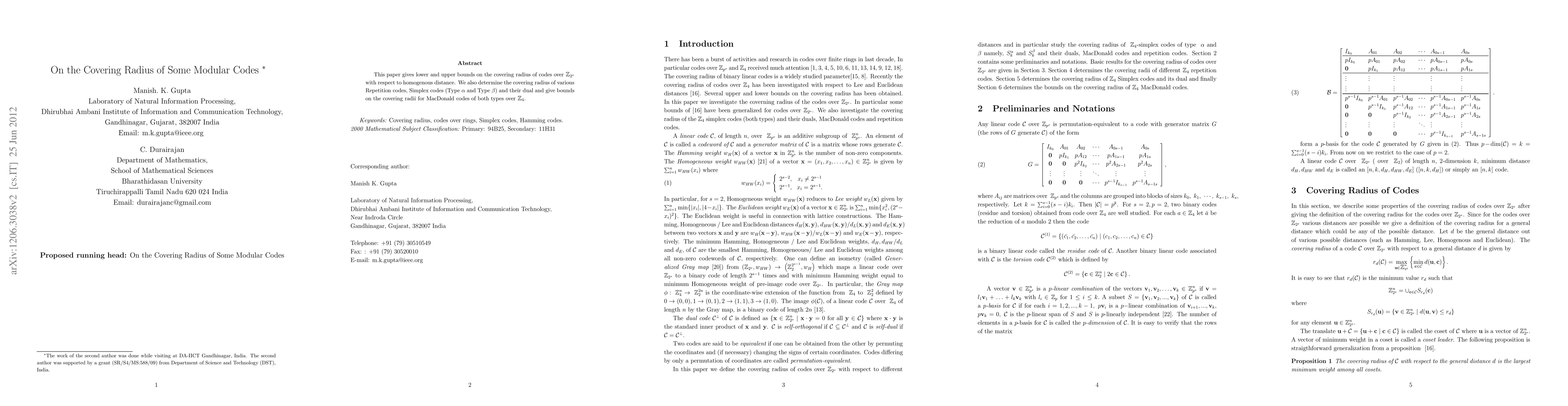 This paper establishes bounds on the covering radius of various modular codes, including Repetition codes and Simplex codes, over finite fields, with implications for error-correcting capabilities.