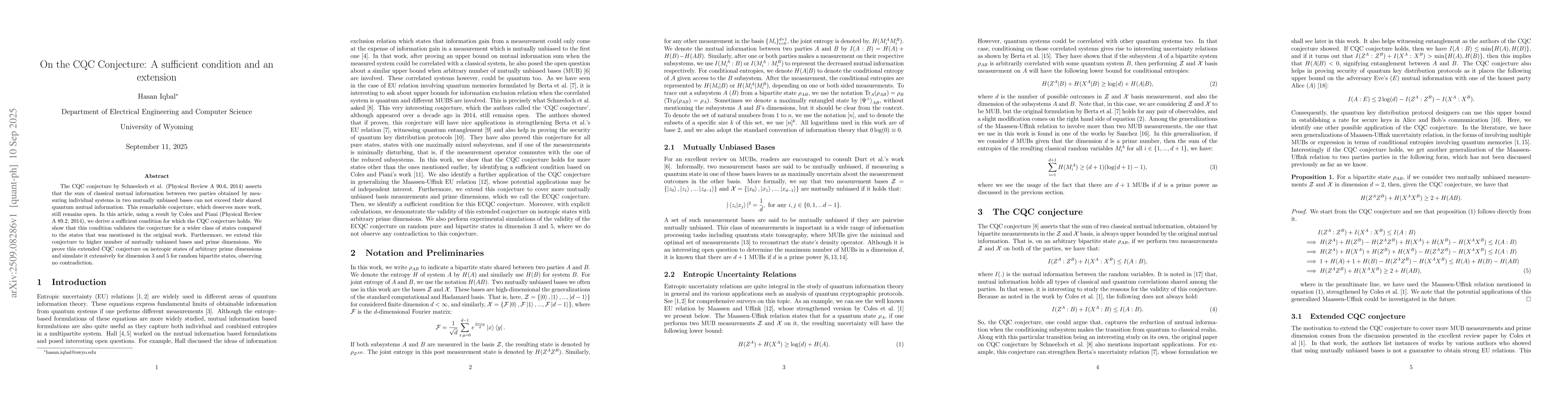 The CQC conjecture by Schneeloch et al. (Physical Review A 90.6, 2014) asserts that the sum of classical mutual information between two parties obtained by measuring individual systems in two mutually unbiased bases can not exceed their shared quantum mutual information. This remarkable conjecture, which deserves more work, still remains open. In this article, using a result by Coles and Piani (Physical Review A 89.2, 2014), we derive a sufficient condition for which the CQC conjecture holds. We show that this condition validates the conjecture for a wider class of states compared to the states that was mentioned in the original work. Furthermore, we extend this conjecture to higher number of mutually unbiased bases and prime dimensions. We prove this extended CQC conjecture on isotropic states of arbitrary prime dimensions and simulate it extensively for dimension 3 and 5 for random bipartite states, observing no contradiction.