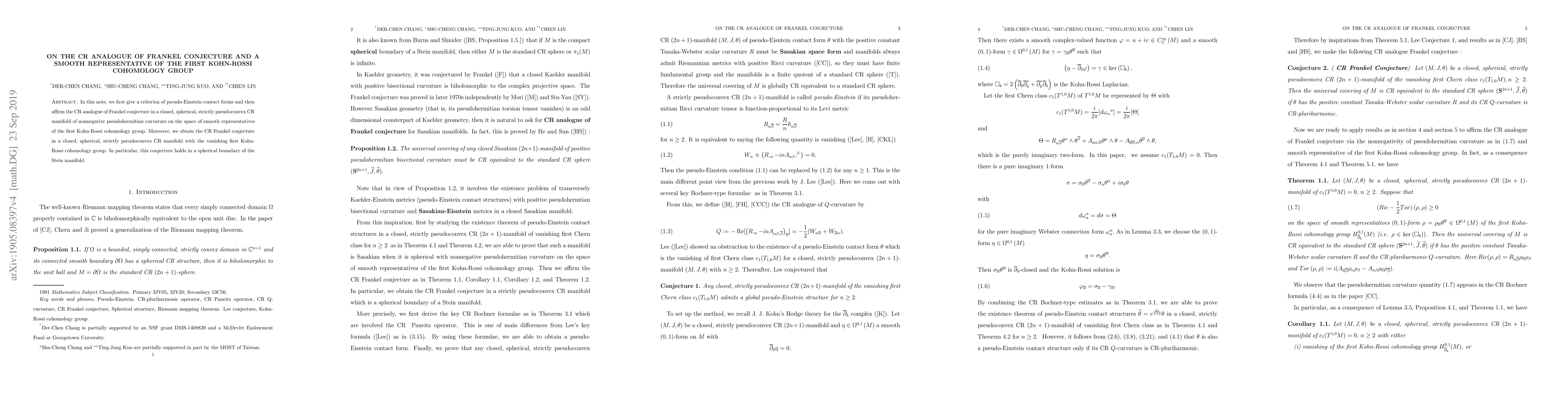 This paper establishes a criterion for pseudo-Einstein contact forms and confirms the CR analogue of Frankel conjecture in strictly pseudoconvex CR manifolds with nonnegative pseudohermitian curvature, particularly in those with vanishing first Kohn-Rossi cohomology group, including spherical boundaries of Stein manifolds.
