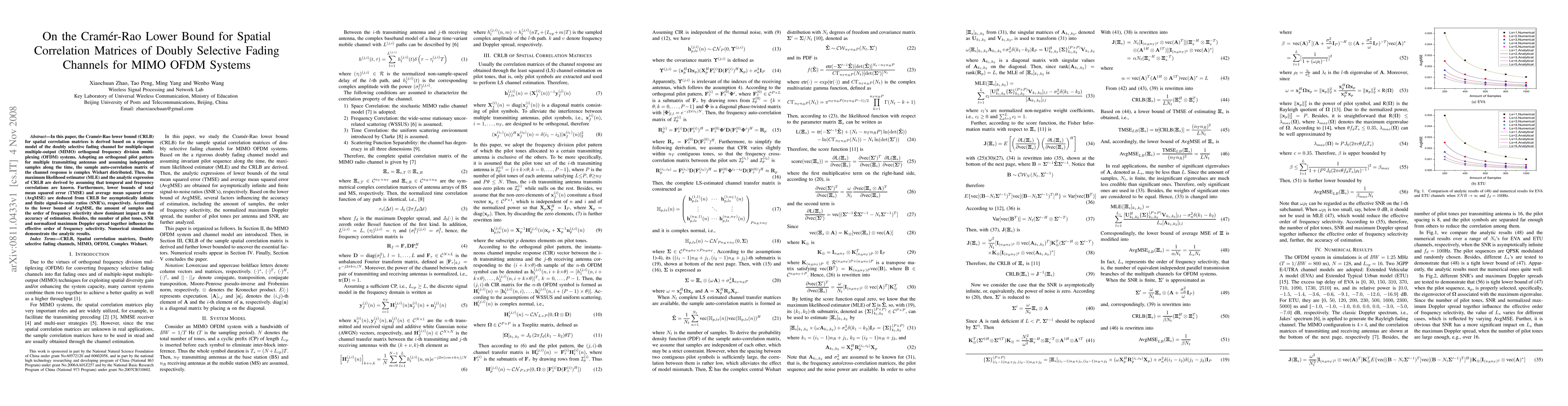 This paper derives the Cramer-Rao Lower Bound (CRLB) for spatial correlation matrices in MIMO OFDM systems under doubly selective fading. It finds that sample size and frequency selectivity significantly affect the CRLB, while pilot tones, SNR, and Doppler spread influence the effective frequency selectivity.
