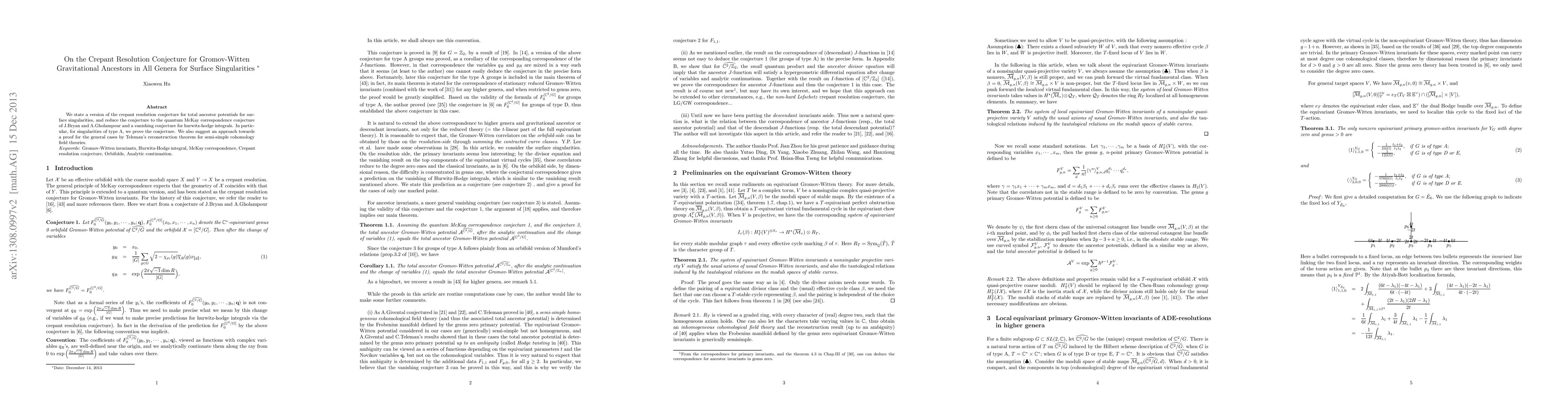 This paper proposes a version of the crepant resolution conjecture for gravitational ancestor potentials in surface singularities, proving it for type A singularities and suggesting a method for other types using Teleman's reconstruction theorem. It connects the conjecture to the quantum McKay correspondence and Hurwitz-Hodge integrals.