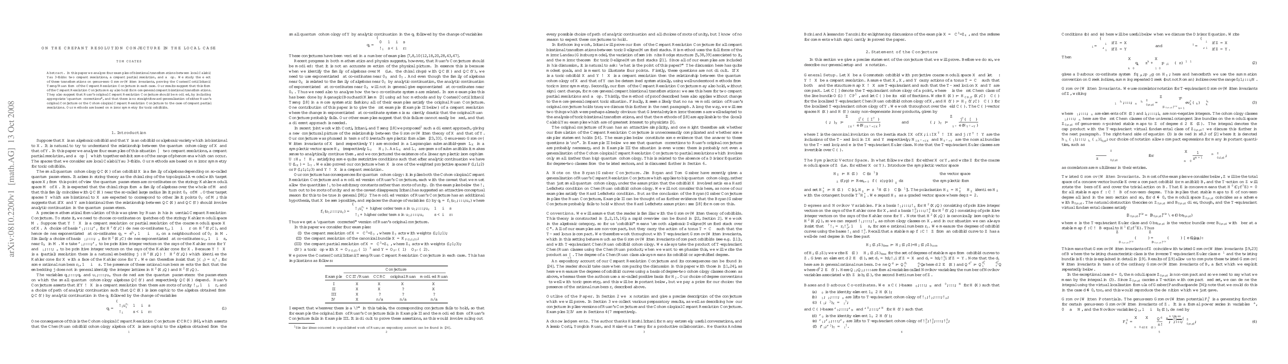 In this paper we analyze four examples of birational transformations between local Calabi-Yau 3-folds: two crepant resolutions, a crepant partial resolution, and a flop. We study the effect of these transformations on genus-zero Gromov-Witten invariants, proving the Coates-Corti-Iritani-Tseng/Ruan form of the Crepant Resolution Conjecture in each case. Our results suggest that this form of the Crepant Resolution Conjecture may also hold for more general crepant birational transformations. They also suggest that Ruan's original Crepant Resolution Conjecture should be modified, by including appropriate "quantum corrections", and that there is no straightforward generalization of either Ruan's original Conjecture or the Cohomological Crepant Resolution Conjecture to the case of crepant partial resolutions. Our methods are based on mirror symmetry for toric orbifolds.
