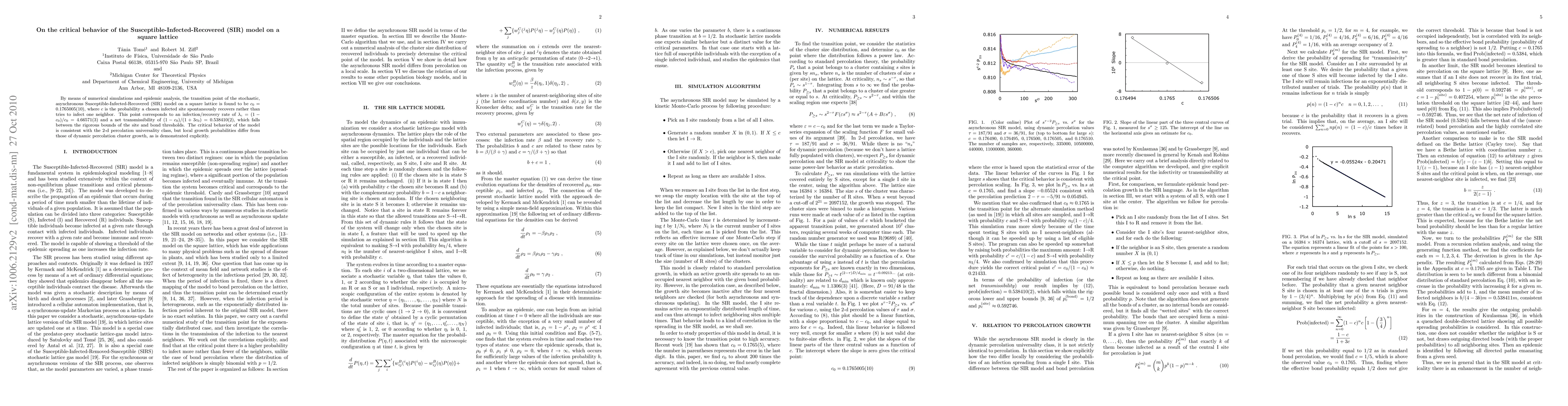 By means of numerical simulations and epidemic analysis, the transition point of the stochastic, asynchronous Susceptible-Infected-Recovered (SIR) model on a square lattice is found to be c_0=0.1765005(10), where c is the probability a chosen infected site spontaneously recovers rather than tries to infect one neighbor. This point corresponds to an infection/recovery rate of lambda_c = (1-c_0)/c_0 = 4.66571(3) and a net transmissibility of (1-c_0)/(1 + 3 c_0) = 0.538410(2), which falls between the rigorous bounds of the site and bond thresholds. The critical behavior of the model is consistent with the 2-d percolation universality class, but local growth probabilities differ from those of dynamic percolation cluster growth, as is demonstrated explicitly.