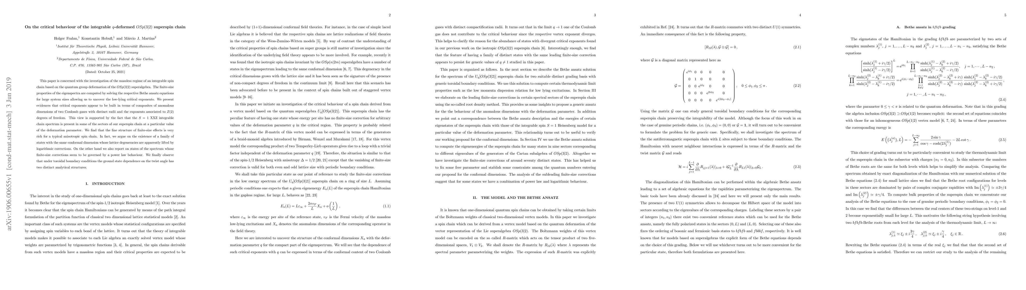This paper is concerned with the investigation of the massless regime of an integrable spin chain based on the quantum group deformation of the $OSp(3|2)$ superalgebra. The finite-size properties of the eigenspectra are computed by solving the respective Bethe ansatz equations for large system sizes allowing us to uncover the low-lying critical exponents. We present evidences that critical exponents appear to be built in terms of composites of anomalous dimensions of two Coulomb gases with distinct radii and the exponents associated to $Z(2)$ degrees of freedom. This view is supported by the fact that the $S=1$ XXZ integrable chain spectrum is present in some of the sectors of our superspin chain at a particular value of the deformation parameter. We find that the fine structure of finite-size effects is very rich for a typical anisotropic spin chain. In fact, we argue on the existence of a family of states with the same conformal dimension whose lattice degeneracies are apparently lifted by logarithmic corrections. On the other hand we also report on states of the spectrum whose finite-size corrections seem to be governed by a power law behaviour. We finally observe that under toroidal boundary conditions the ground state dependence on the twist angle has two distinct analytical structures.