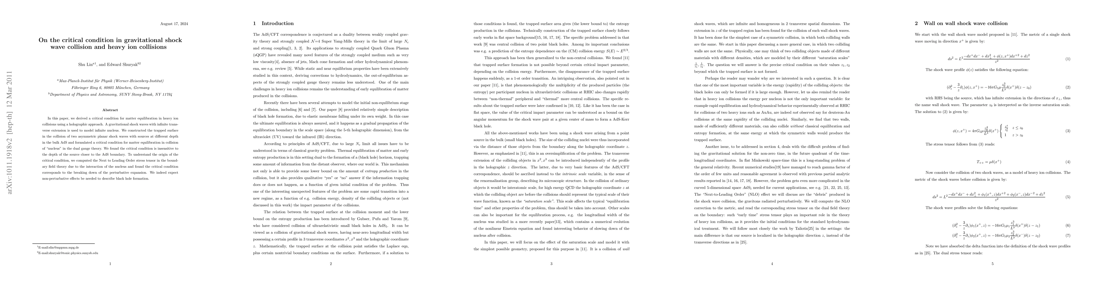 In this paper, we derived a critical condition for matter equilibration in heavy ion collisions using a holographic approach. A gravitational shock waves with infinite transverse extension is used to model infinite nucleus. We constructed the trapped surface in the collision of two asymmetric planar shock waves with sources at different depth in the bulk AdS and formulated a critical condition for matter equilibration in collision of "nucleus" in the dual gauge theory. We found the critical condition is insensitive to the depth of the source closer to the AdS boundary. To understand the origin of the critical condition, we computed the Next to Leading Order stress tensor in the boundary field theory due to the interaction of the nucleus and found the critical condition corresponds to the breaking down of the perturbative expansion. We indeed expect non-perturbative effects be needed to describe black hole formation.