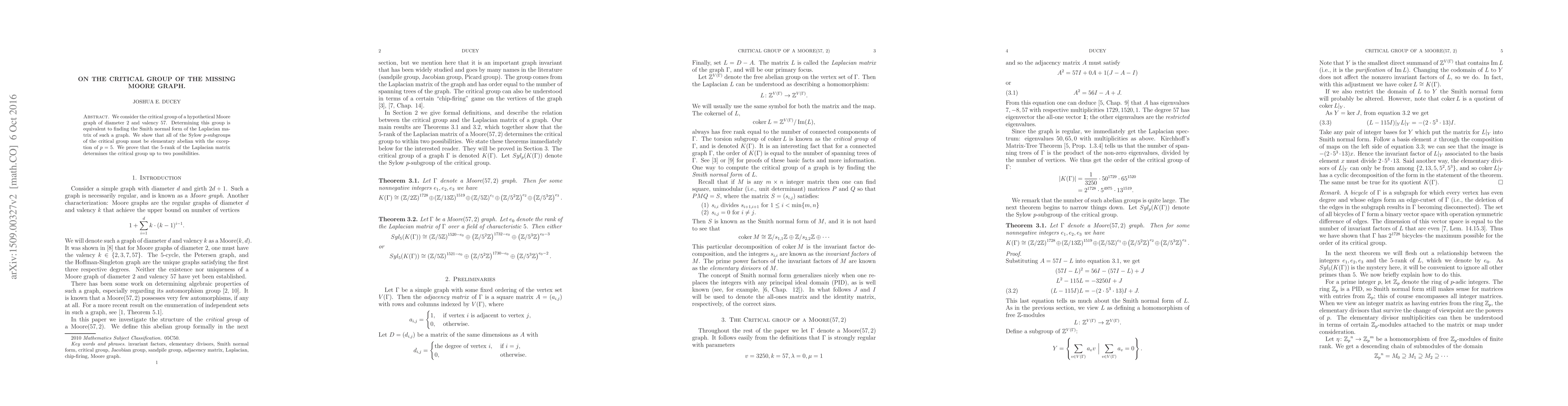 This paper investigates the critical group of a hypothetical Moore graph with diameter 2 and valency 57, showing that its Sylow subgroups are elementary abelian except for the 5-subgroup. The 5-rank of the Laplacian matrix determines the critical group up to two possibilities.