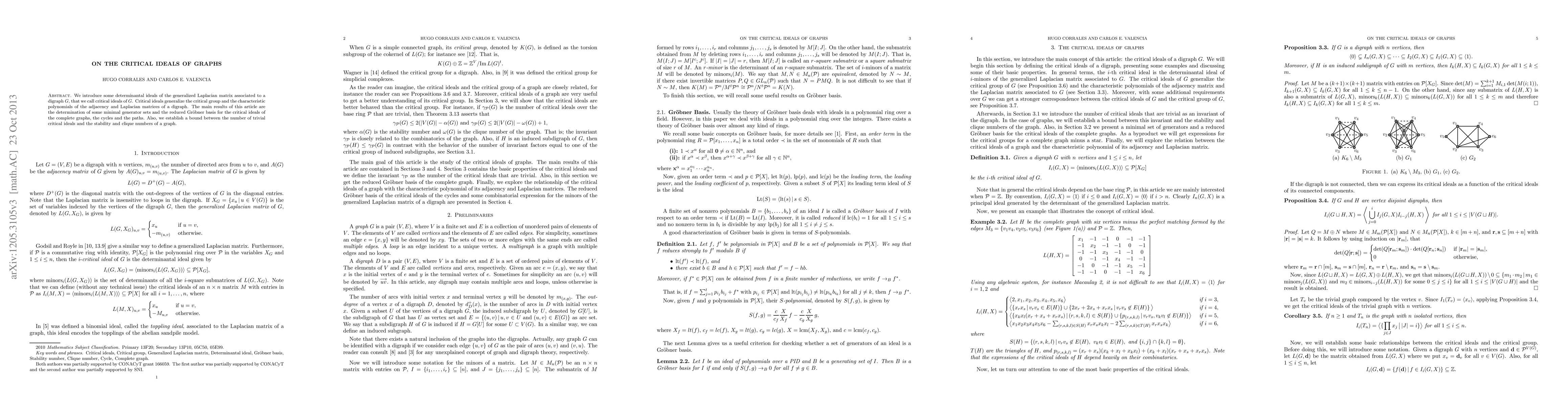 This paper introduces determinantal ideals called critical ideals of a digraph G, which generalize the critical group and characteristic polynomials of adjacency and Laplacian matrices. The authors determine minimal generator sets and reduced Grobner bases for critical ideals of complete graphs, cycles, and paths, and establish a connection between the number of trivial critical ideals and graph stability and clique numbers.