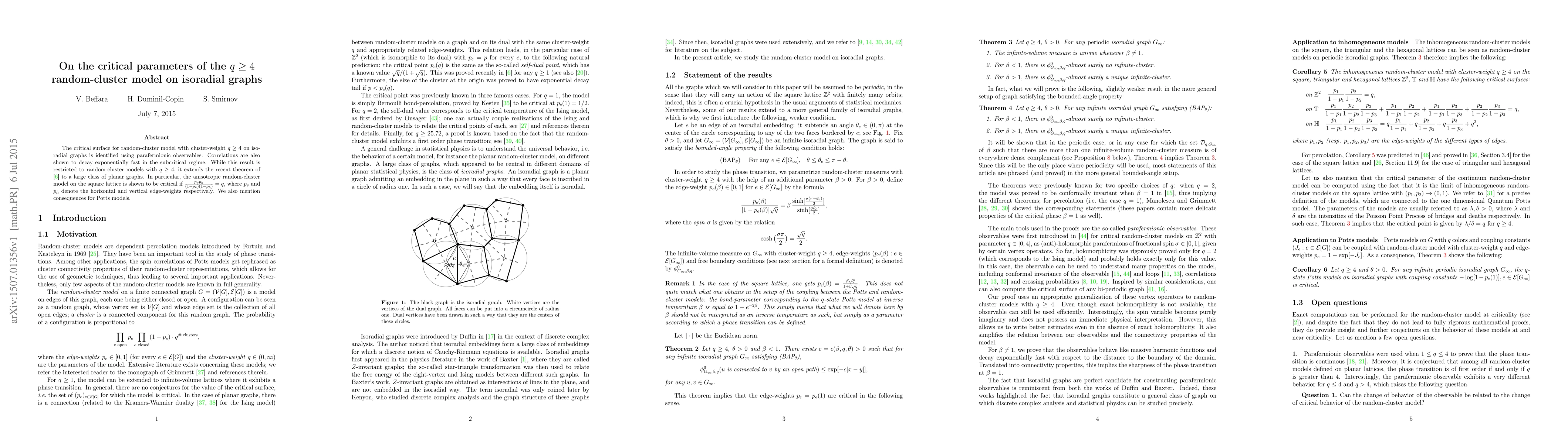 Summary: The paper identifies the critical surface for the random-cluster model with $q\ge 4$ on isoradial graphs using parafermionic observables, demonstrating exponential decay of correlations in the subcritical regime. It extends findings to a broad class of planar graphs, including the anisotropic random-cluster model on the square lattice, and discusses implications for Potts models.