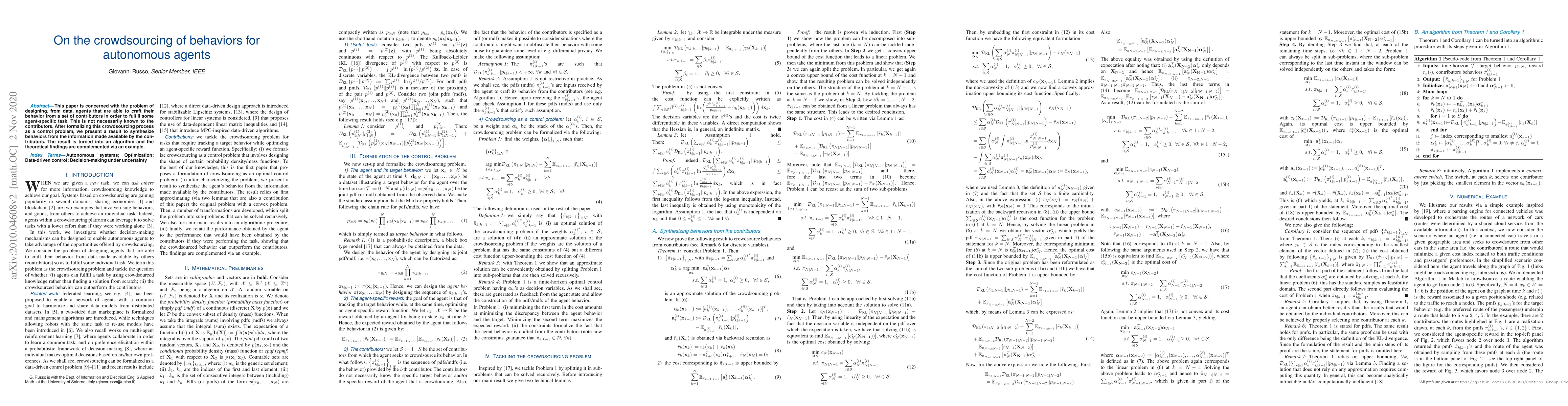 This paper develops a method to design autonomous agents that can synthesize behaviors from crowdsourced contributions to fulfill specific tasks, formalizing the crowdsourcing process as a control problem and presenting an algorithmic solution supported by a numerical example.