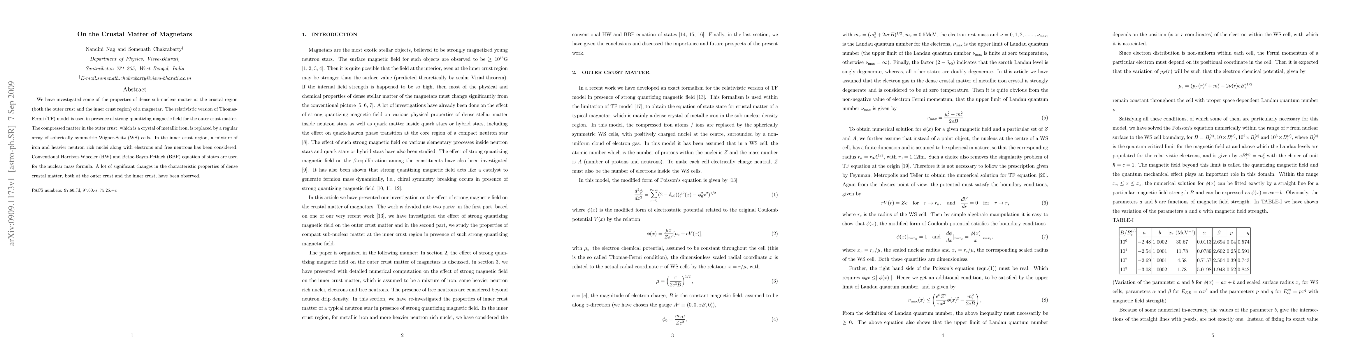 We have investigated some of the properties of dense sub-nuclear matter at the crustal region (both the outer crust and the inner crust region) of a magnetar. The relativistic version of Thomas-Fermi (TF) model is used in presence of strong quantizing magnetic field for the outer crust matter. The compressed matter in the outer crust, which is a crystal of metallic iron, is replaced by a regular array of spherically symmetric Wigner-Seitz (WS) cells. In the inner crust region, a mixture of iron and heavier neutron rich nuclei along with electrons and free neutrons has been considered. Conventional Harrison-Wheeler (HW) and Bethe-Baym-Pethick (BBP) equation of states are used for the nuclear mass formula. A lot of significant changes in the characteristic properties of dense crustal matter, both at the outer crust and the inner crust, have been observed.