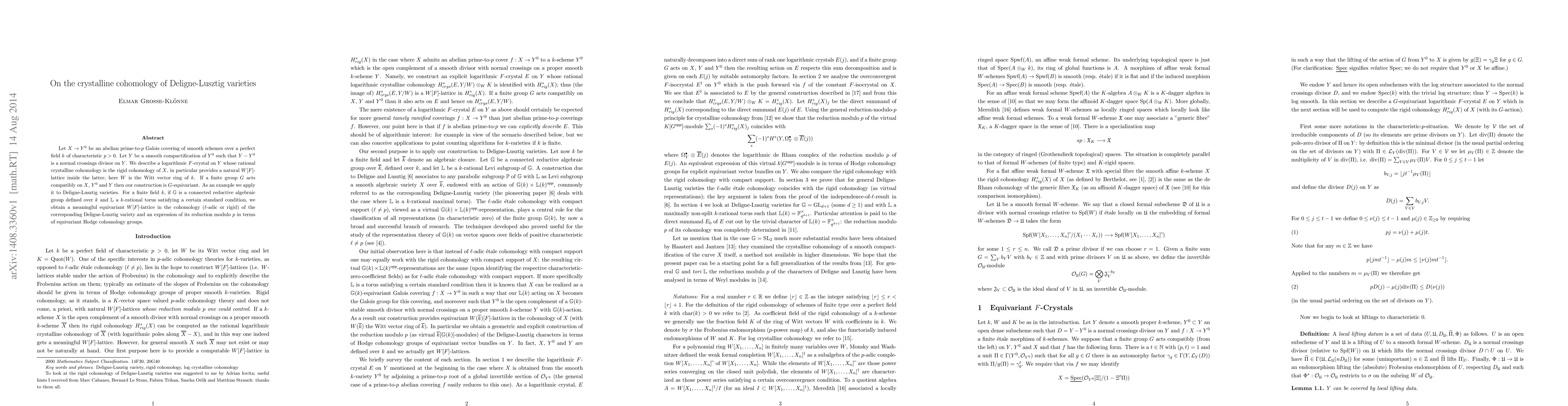 Let $X\to Y^0$ be an abelian prime-to-$p$ Galois covering of smooth schemes over a perfect field $k$ of characteristic $p>0$. Let $Y$ be a smooth compactification of $Y^0$ such that $Y-Y^0$ is a normal crossings divisor on $Y$. We describe a logarithmic $F$-crystal on $Y$ whose rational crystalline cohomology is the rigid cohomology of $X$, in particular provides a natural $W[F]$-lattice inside the latter; here $W$ is the Witt vector ring of $k$. If a finite group $G$ acts compatibly on $X$, $Y^0$ and $Y$ then our construction is $G$-equivariant. As an example we apply it to Deligne-Lusztig varieties. For a finite field $k$, if ${\mathbb G}$ is a connected reductive algebraic group defined over $k$ and ${\mathbb L}$ a $k$-rational torus satisfying a certain standard condition, we obtain a meaningful equivariant $W[F]$-lattice in the cohomology ($\ell$-adic or rigid) of the corresponding Deligne-Lusztig variety and an expression of its reduction modulo $p$ in terms of equivariant Hodge cohomology groups.