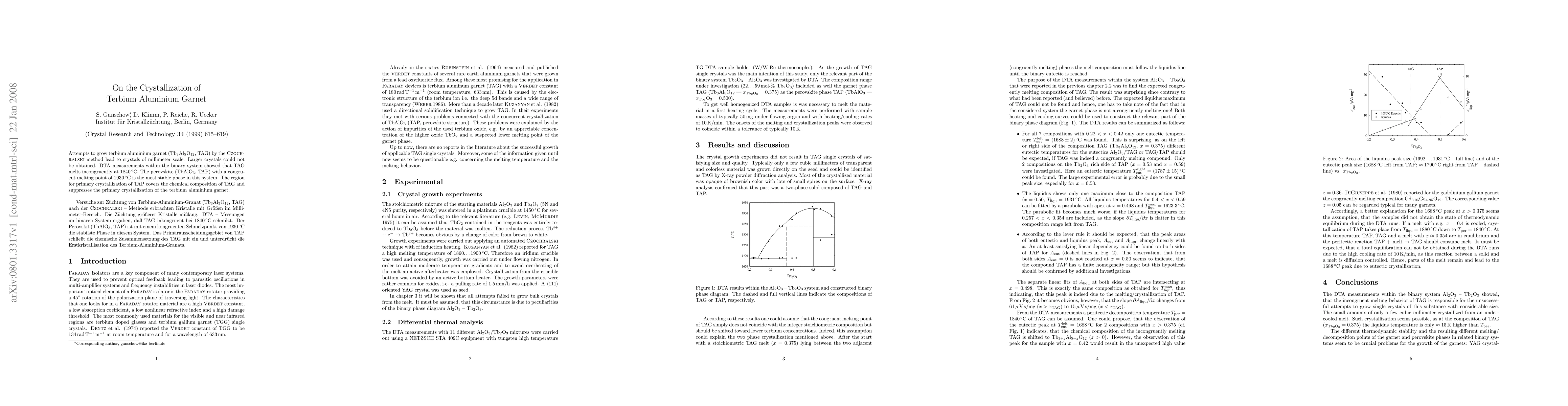Attempts to grow terbium aluminium garnet (Tb3Al5O12, TAG) by the Czochralski method lead to crystals of millimeter scale. Larger crystals could not be obtained. DTA measurements within the binary system showed that TAG melts incongruently at 1840 deg. C. The perovskite (TbAlO3, TAP) with a congruent melting point of 1930 deg. C is the most stable phase in this system. The region for primary crystallization of TAP covers the chemical composition of TAG and suppresses the primary crystallization of the terbium aluminium garnet.