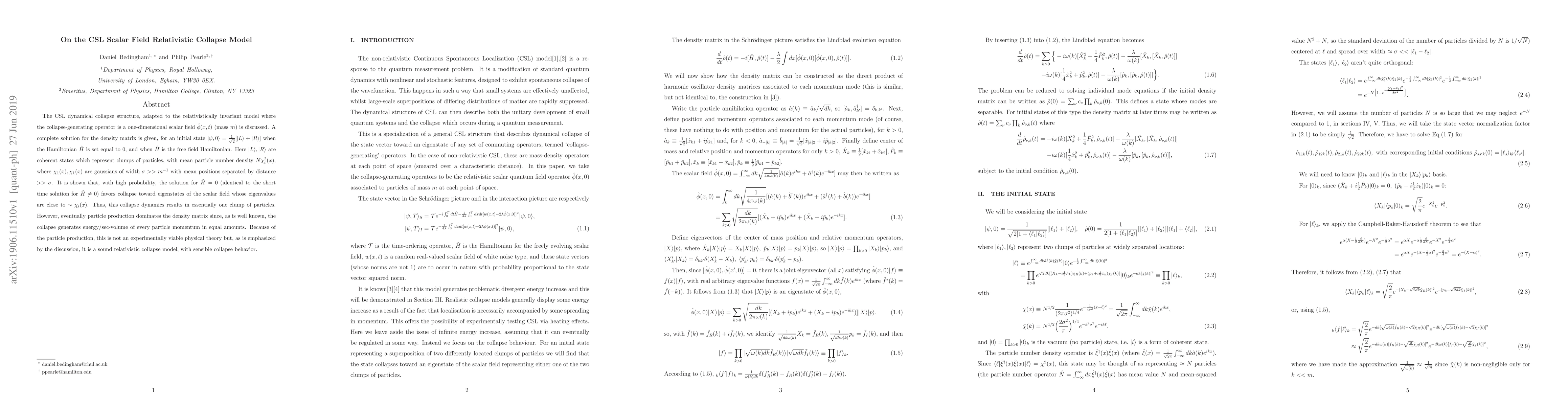 The CSL dynamical collapse structure, adapted to the relativistically invariant model where the collapse-generating operator is a one-dimensional scalar field $\hat\phi(x,t)$ (mass $m$) is discussed. A complete solution for the density matrix is given, for an initial state $|\psi,0\rangle=\frac{1}{\sqrt{2}}[|L\rangle+|R\rangle]$ when the Hamiltonian $\hat H$ is set equal to 0, and when $\hat H$ is the free field Hamiltonian. Here $|L\rangle, |R\rangle$ are coherent states which represent clumps of particles, with mean particle number density $N\chi_{i}^{2}(x)$, where $\chi_{1}(x),\chi_{1}(x) $ are gaussians of width $\sigma>>m^{-1}$ with mean positions separated by distance $>>\sigma$. It is shown that, with high probability, the solution for $\hat H=0$ (identical to the short time solution for $\hat H\neq 0$) favors collapse toward eigenstates of the scalar field whose eigenvalues are close to $\sim\chi_{i}(x)$. Thus, this collapse dynamics results in essentially one clump of particles. However, eventually particle production dominates the density matrix since, as is well known, the collapse generates energy/sec-volume of every particle momentum in equal amounts. Because of the particle production, this is not an experimentally viable physical theory but, as is emphasized by the discussion, it is a sound relativistic collapse model, with sensible collapse behavior.