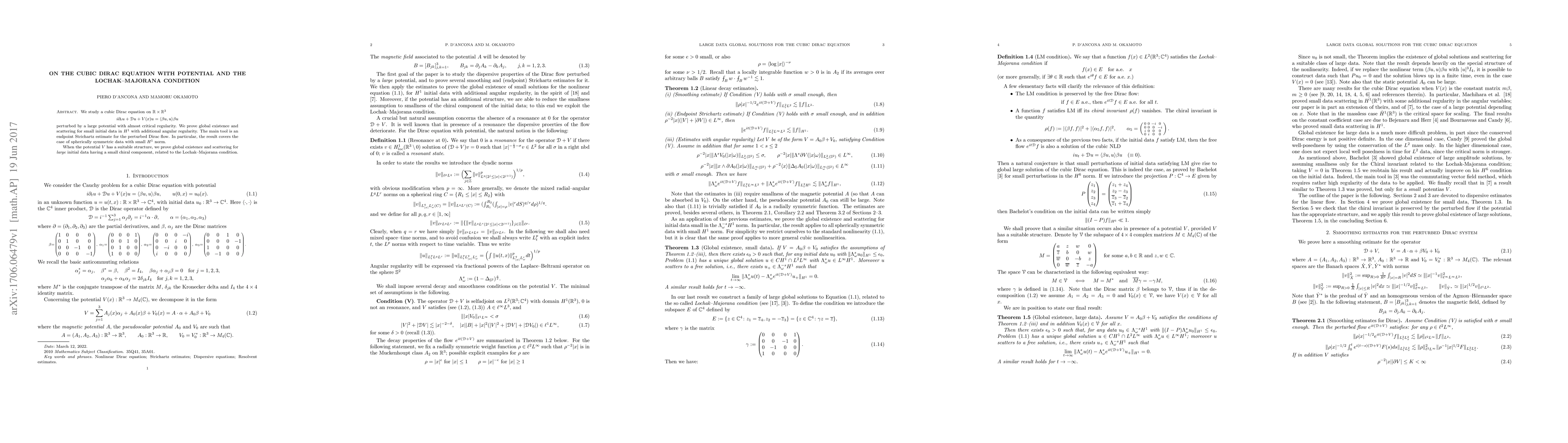 Summary: This paper investigates the cubic Dirac equation under a potential perturbation, proving global existence and scattering for small initial data. It employs Strichartz estimates and covers scenarios where initial data has a small chiral component, linked to the Lochak--Majorana condition.