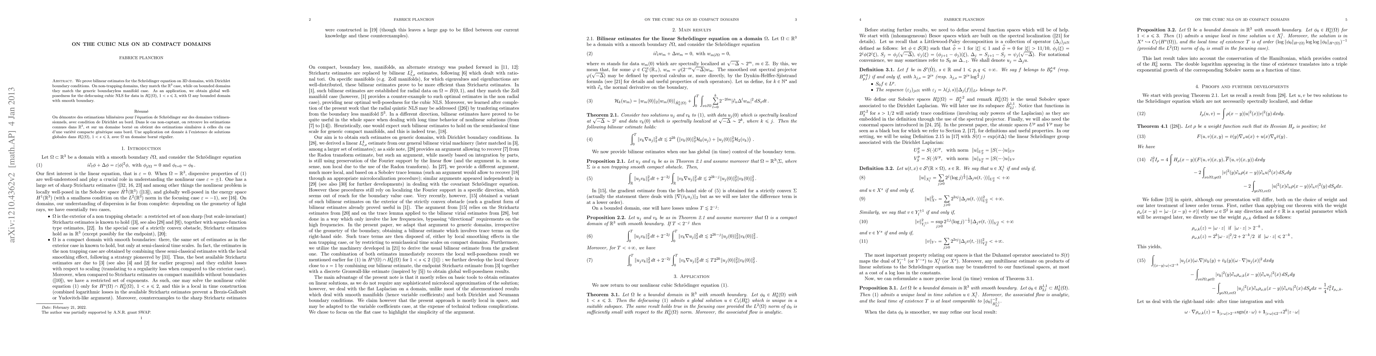 This paper proves bilinear estimates for the 3D Schrödinger equation on compact domains with Dirichlet conditions, showing equivalence to the $\mathbb{R}^3$ case on non-trapping domains and to boundaryless manifold cases on bounded domains. It also establishes global well-posedness for the cubic NLS with initial data in $H^s_0(\Omega)$ for $1<s\leq 3$.