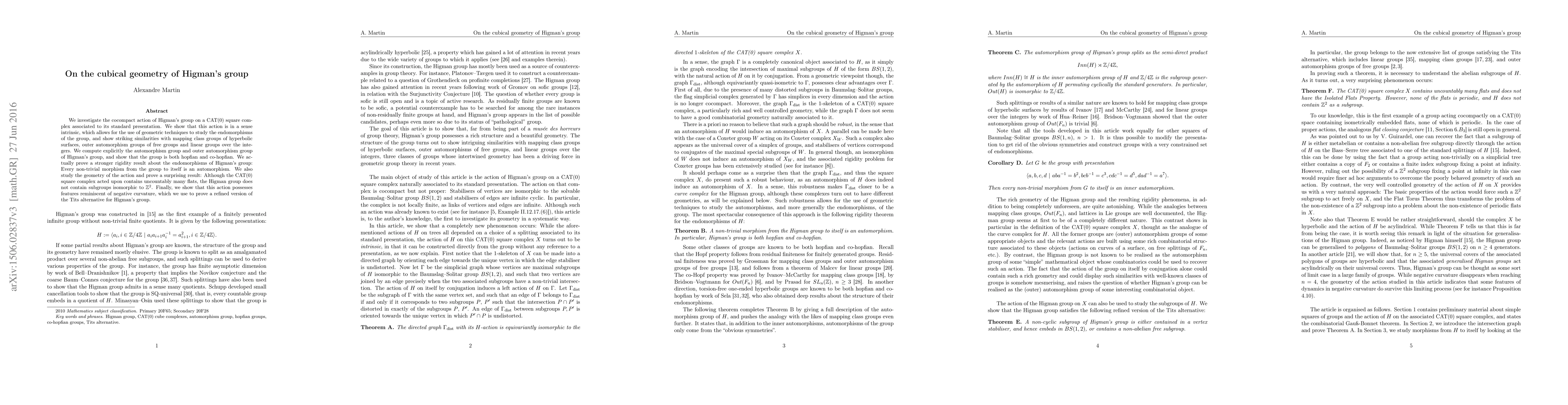 This paper explores the cocompact action of Higman's group on a CAT(0) square complex, revealing intrinsic geometric properties and striking similarities with other notable groups. It demonstrates that every non-trivial endomorphism of the group is an automorphism, and highlights the absence of Z^2 subgroups despite the complex's many flats.