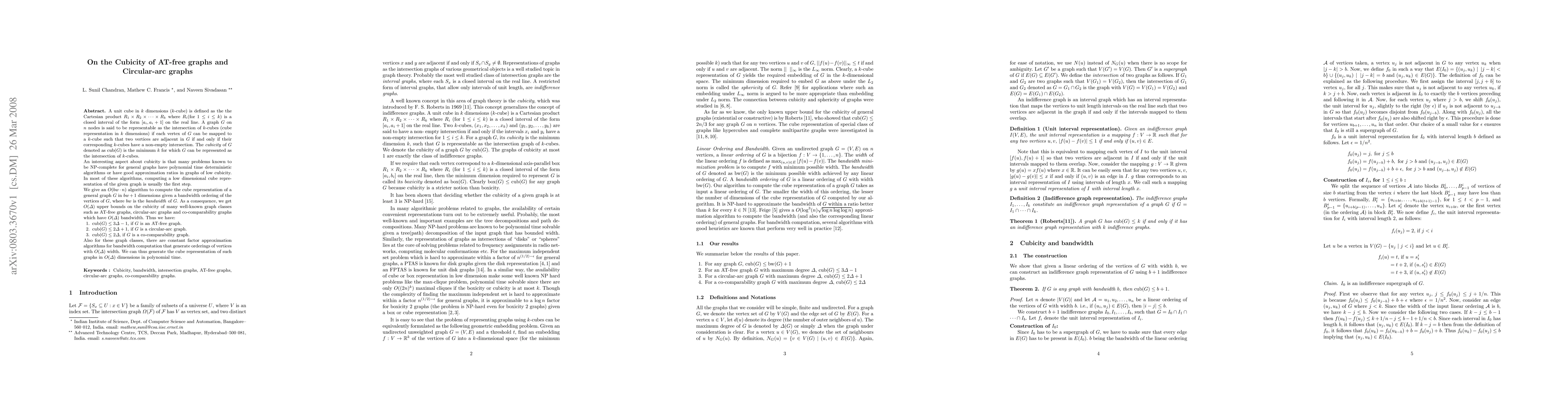 This paper presents an algorithm to compute the cube representation of AT-free graphs and circular-arc graphs in $O(\Delta)$ dimensions, where $\Delta$ is the maximum degree. It establishes upper bounds on the cubicity of these graphs, showing $\cubi(G) \leq 3\Delta-1$ for AT-free graphs and $\cubi(G) \leq 2\Delta+1$ for circular-arc graphs.