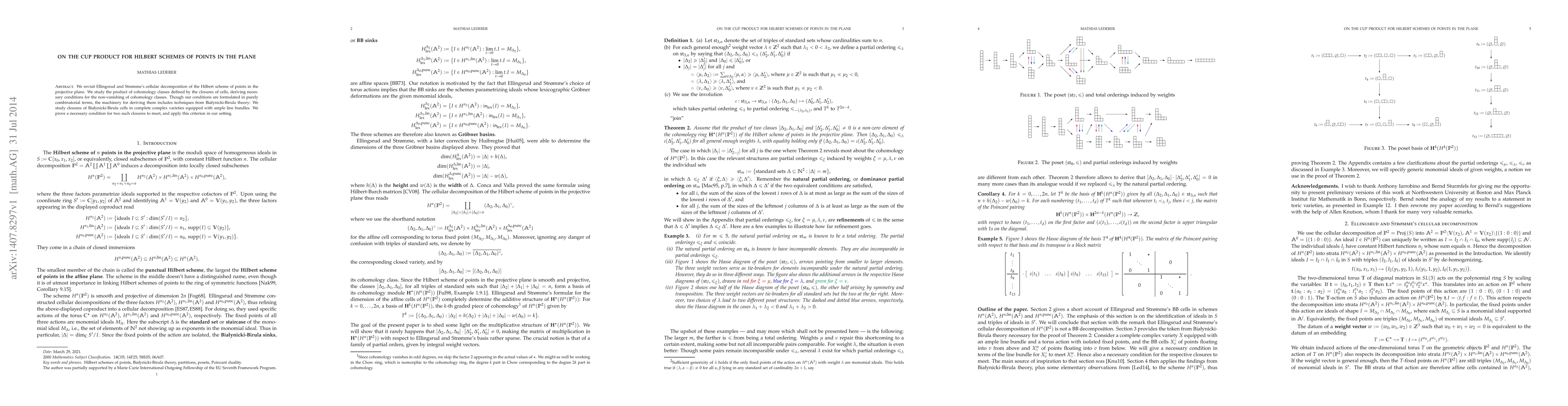 This paper revisits Ellingsrud and Str{\o}mme's cellular decomposition of the Hilbert scheme of points in the projective plane, focusing on the cup product of cohomology classes defined by cell closures. It employs Bia{\l}ynicki-Birula theory to derive combinatorial conditions for non-vanishing cohomology classes and proves a necessary condition for cell closures to intersect.