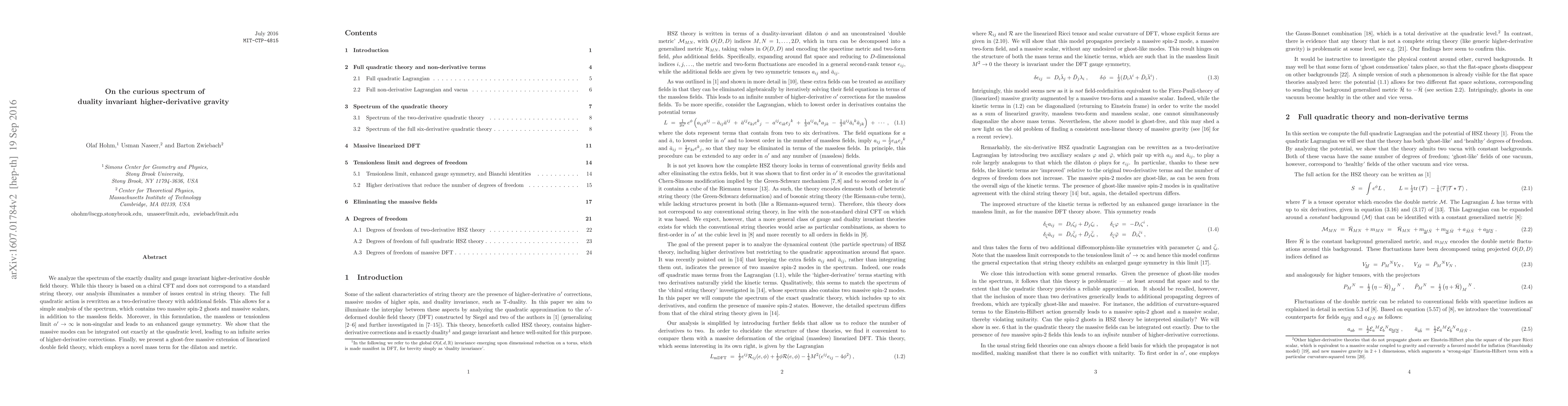 We analyze the spectrum of the exactly duality and gauge invariant higher-derivative double field theory. While this theory is based on a chiral CFT and does not correspond to a standard string theory, our analysis illuminates a number of issues central in string theory. The full quadratic action is rewritten as a two-derivative theory with additional fields. This allows for a simple analysis of the spectrum, which contains two massive spin-2 ghosts and massive scalars, in addition to the massless fields. Moreover, in this formulation, the massless or tensionless limit $\alpha'\rightarrow \infty$ is non-singular and leads to an enhanced gauge symmetry. We show that the massive modes can be integrated out exactly at the quadratic level, leading to an infinite series of higher-derivative corrections. Finally, we present a ghost-free massive extension of linearized double field theory, which employs a novel mass term for the dilaton and metric.