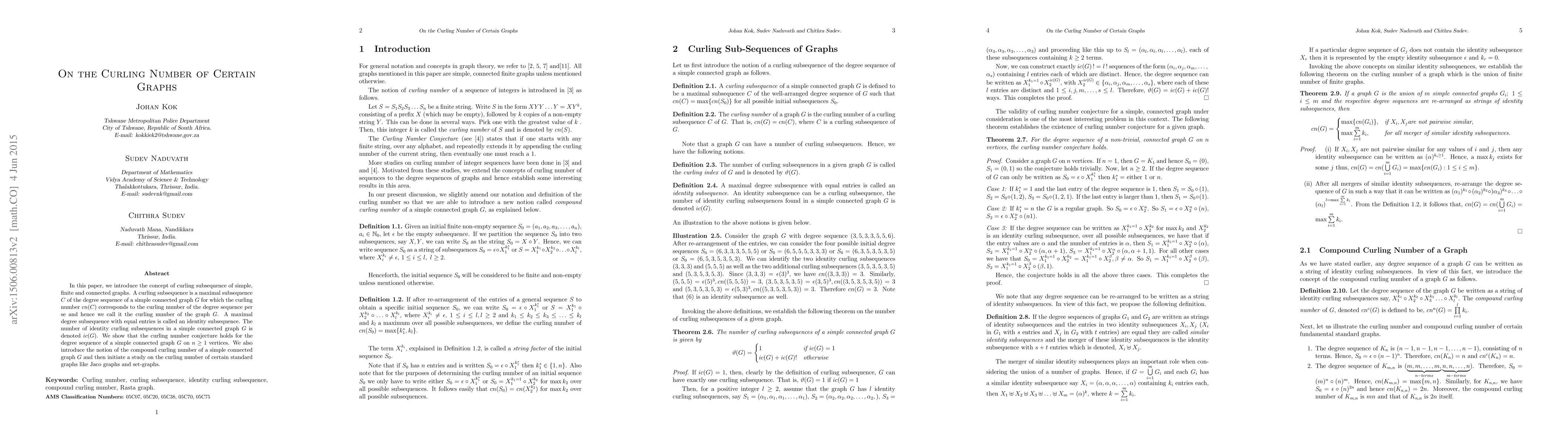 This paper introduces the concept of curling subsequences in simple, finite, connected graphs, defining the curling number as the curling number of the degree sequence. It proves the curling number conjecture for such graphs and explores the compound curling number, initiating a study on standard graphs like Jaco graphs and set-graphs.