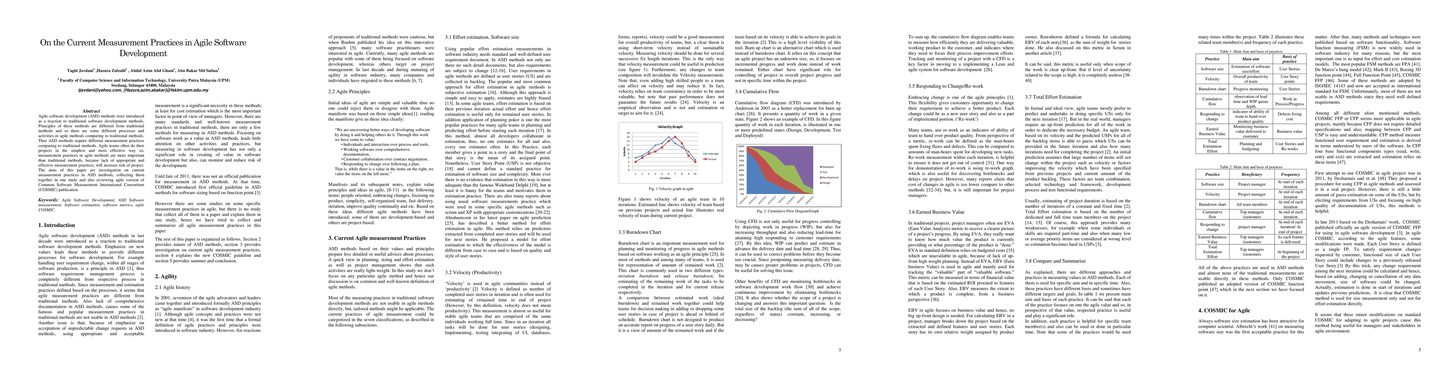 Agile software development (ASD) methods were introduced as a reaction to traditional software development methods. Principles of these methods are different from traditional methods and so there are some different processes and activities in agile methods comparing to traditional methods. Thus ASD methods require different measurement practices comparing to traditional methods. Agile teams often do their projects in the simplest and most effective way so, measurement practices in agile methods are more important than traditional methods, because lack of appropriate and effective measurement practices, will increase risk of project. The aims of this paper are investigation on current measurement practices in ASD methods, collecting them together in one study and also reviewing agile version of Common Software Measurement International Consortium (COSMIC) publication.
