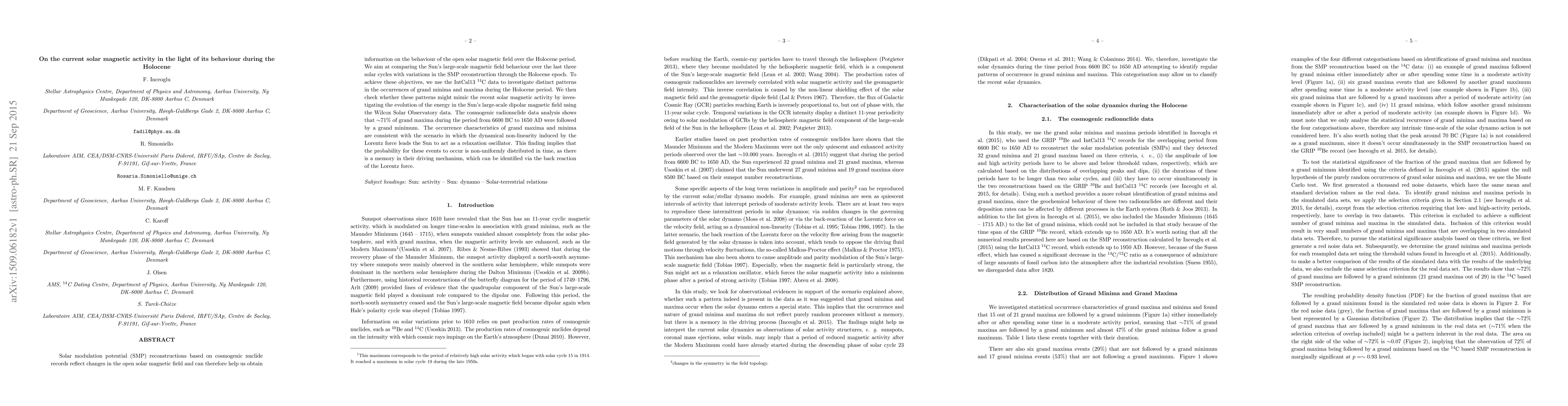 Solar modulation potential (SMP) reconstructions based on cosmogenic nuclide records reflect changes in the open solar magnetic field and can therefore help us obtain information on the behaviour of the open solar magnetic field over the Holocene period. We aim at comparing the Sun's large-scale magnetic field behaviour over the last three solar cycles with variations in the SMP reconstruction through the Holocene epoch. To achieve these objectives, we use the IntCal13 $^{14}$C data to investigate distinct patterns in the occurrences of grand minima and maxima during the Holocene period. We then check whether these patterns might mimic the recent solar magnetic activity by investigating the evolution of the energy in the Sun's large-scale dipolar magnetic field using the Wilcox Solar Observatory data. The cosmogenic radionuclide data analysis shows that $\sim$71\% of grand maxima during the period from 6600 BC to 1650 AD were followed by a grand minimum. The occurrence characteristics of grand maxima and minima are consistent with the scenario in which the dynamical non-linearity induced by the Lorentz force leads the Sun to act as a relaxation oscillator. This finding implies that the probability for these events to occur is non-uniformly distributed in time, as there is a memory in their driving mechanism, which can be identified via the back reaction of the Lorentz force.