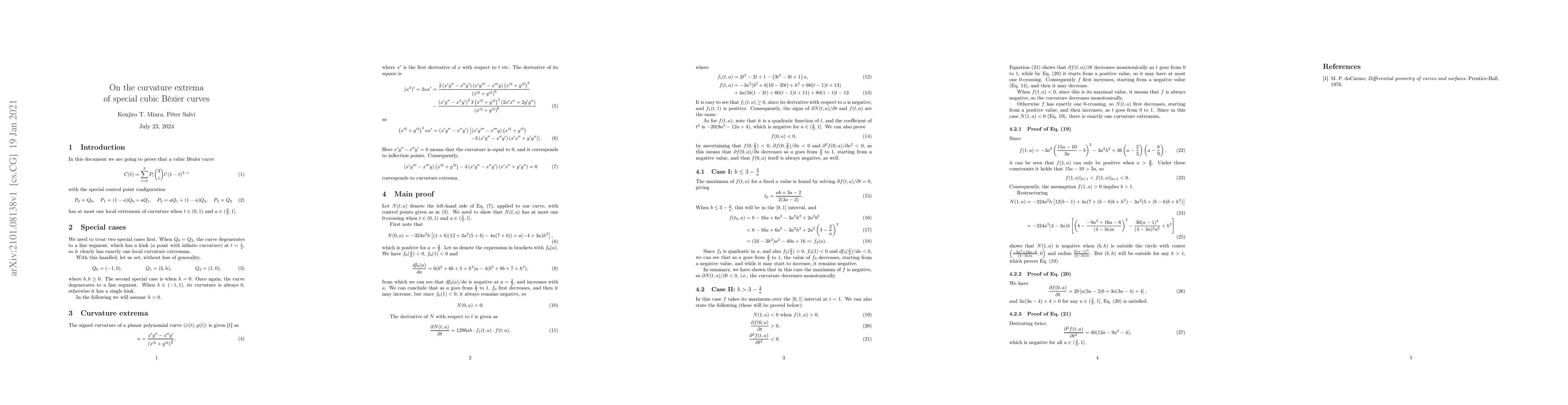 Summary: This paper demonstrates that special cubic Bézier curves, derived from quadratic curves via a scalar parameter, possess at most one local curvature extremum within the parameter interval $(0,1)$. The findings provide insight into the geometric properties of these curves.