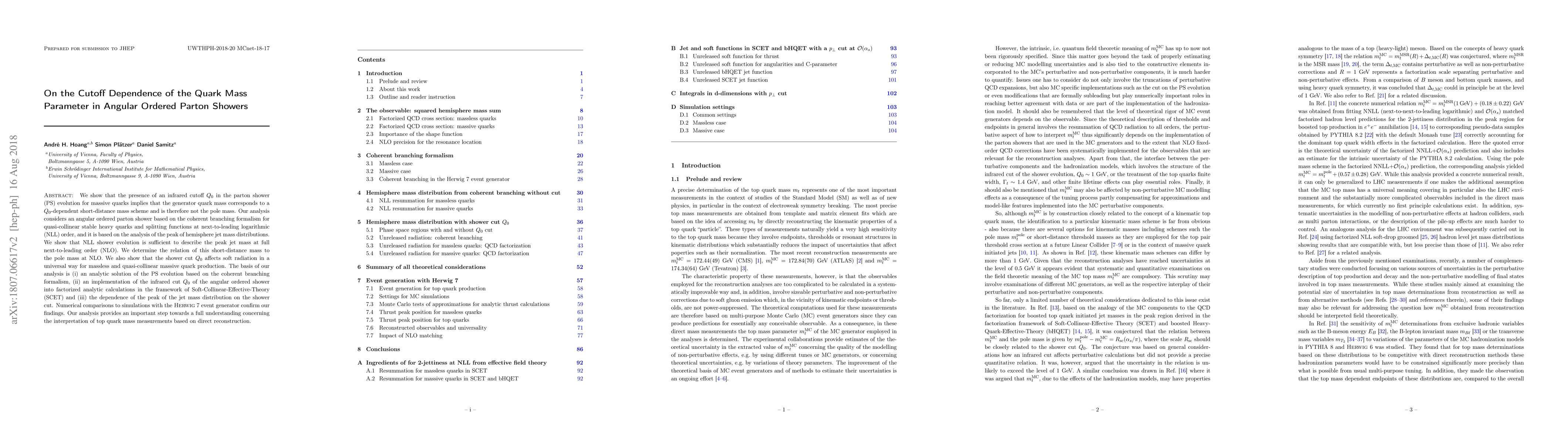 We show that the presence of an infrared cutoff $Q_0$ in the parton shower (PS) evolution for massive quarks implies that the generator quark mass corresponds to a $Q_0$-dependent short-distance mass scheme and is therefore not the pole mass. Our analysis considers an angular ordered parton shower based on the coherent branching formalism for quasi-collinear stable heavy quarks and splitting functions at next-to-leading logarithmic (NLL) order, and it is based on the analysis of the peak of hemisphere jet mass distributions. We show that NLL shower evolution is sufficient to describe the peak jet mass at full next-to-leading order (NLO). We determine the relation of this short-distance mass to the pole mass at NLO. We also show that the shower cut $Q_0$ affects soft radiation in a universal way for massless and quasi-collinear massive quark production. The basis of our analysis is (i) an analytic solution of the PS evolution based on the coherent branching formalism, (ii) an implementation of the infrared cut $Q_0$ of the angular ordered shower into factorized analytic calculations in the framework of Soft-Collinear-Effective-Theory (SCET) and (iii) the dependence of the peak of the jet mass distribution on the shower cut. Numerical comparisons to simulations with the HERWIG 7 event generator confirm our findings. Our analysis provides an important step towards a full understanding concerning the interpretation of top quark mass measurements based on direct reconstruction.