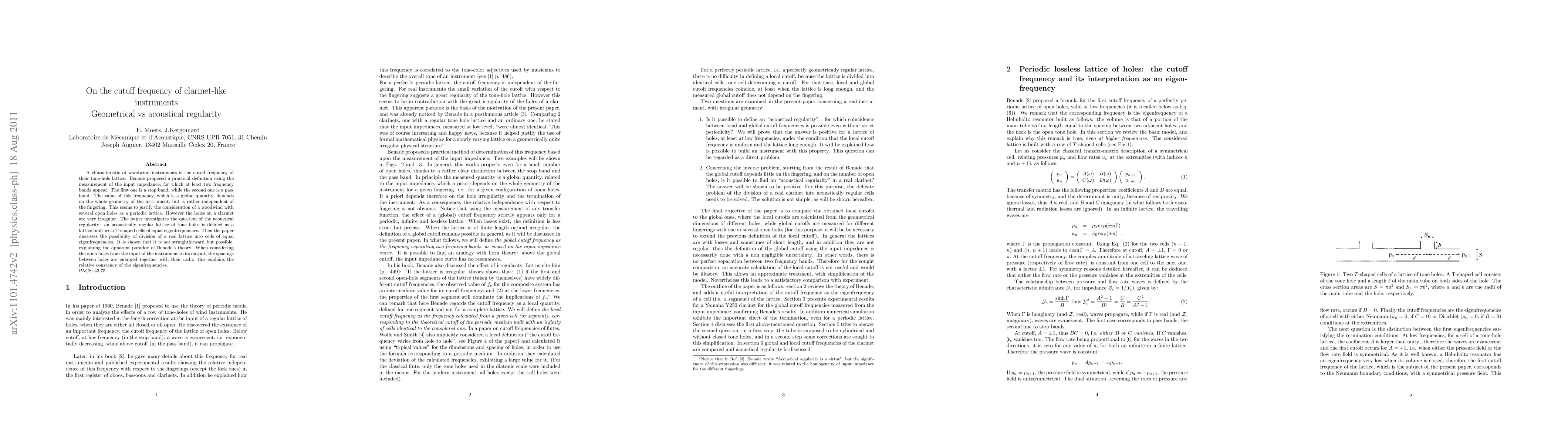 A characteristic of woodwind instruments is the cutoff frequency of their tone-hole lattice. Benade proposed a practical definition using the measurement of the input impedance, for which at least two frequency bands appear. The first one is a stop band, while the second one is a pass band. The value of this frequency, which is a global quantity, depends on the whole geometry of the instrument, but is rather independent of the fingering. This seems to justify the consideration of a woodwind with several open holes as a periodic lattice. However the holes on a clarinet are very irregular. The paper investigates the question of the acoustical regularity: an acoustically regular lattice of tone holes is defined as a lattice built with T-shaped cells of equal eigenfrequencies. Then the paper discusses the possibility of division of a real lattice into cells of equal eigenfrequencies. It is shown that it is not straightforward but possible, explaining the apparent paradox of Benade's theory. When considering the open holes from the input of the instrument to its output, the spacings between holes are enlarged together with their radii: this explains the relative constancy of the eigenfrequencies.