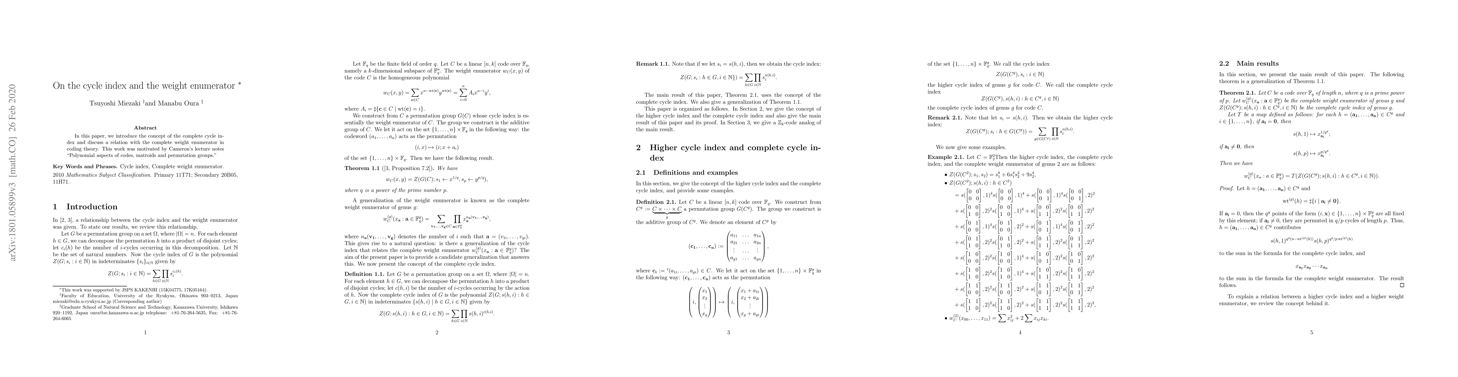 Summary: This paper introduces the complete cycle index and explores its relationship with the complete weight enumerator in coding theory, inspired by Cameron's lecture notes on codes, matroids, and permutation groups. The study aims to establish connections between these mathematical concepts.