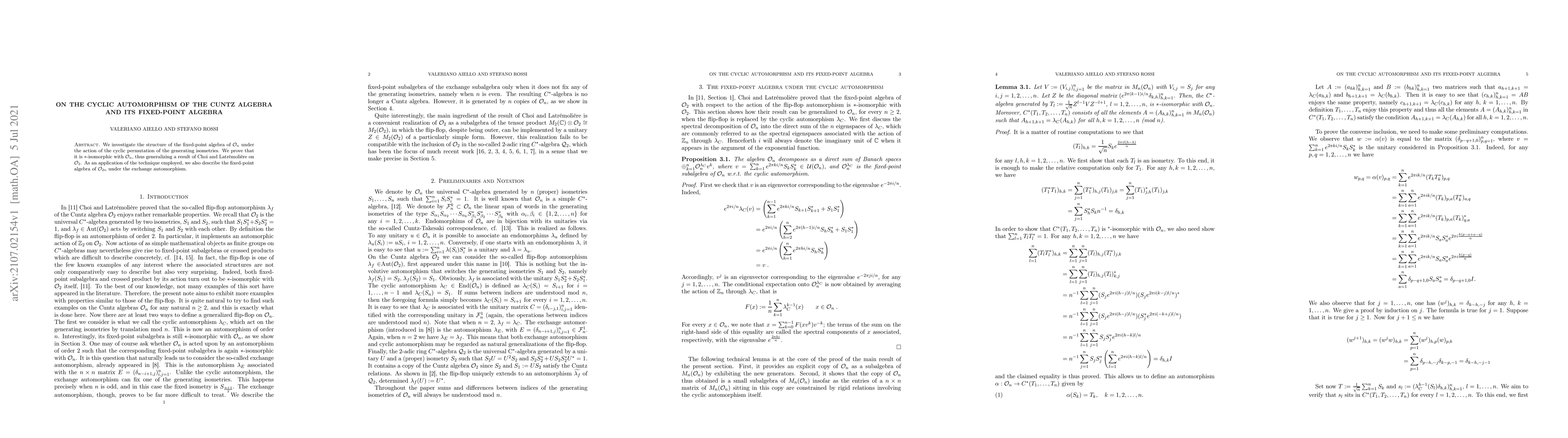 We investigate the structure of the fixed-point algebra of $\mathcal{O}_n$ under the action of the cyclic permutation of the generating isometries. We prove that it is $*$-isomorphic with $\mathcal{O}_n$, thus generalizing a result of Choi and Latr\'emoli\`ere on $\mathcal{O}_2$. As an application of the technique employed, we also describe the fixed-point algebra of $\mathcal{O}_{2n}$ under the exchange automorphism.