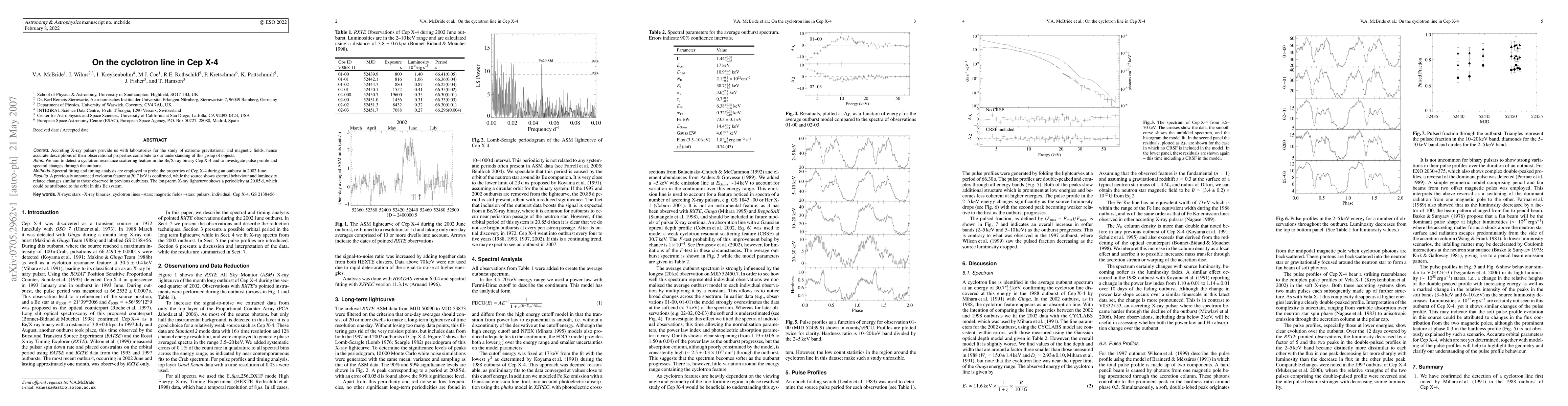 The paper confirms a cyclotron feature at 30.7 keV in the Be/X-ray binary Cep X-4 using spectral fitting and timing analysis during a 2002 outburst. It also identifies a 20.85 d periodicity in the long-term X-ray lightcurve, potentially linked to the orbit in this Be system.
