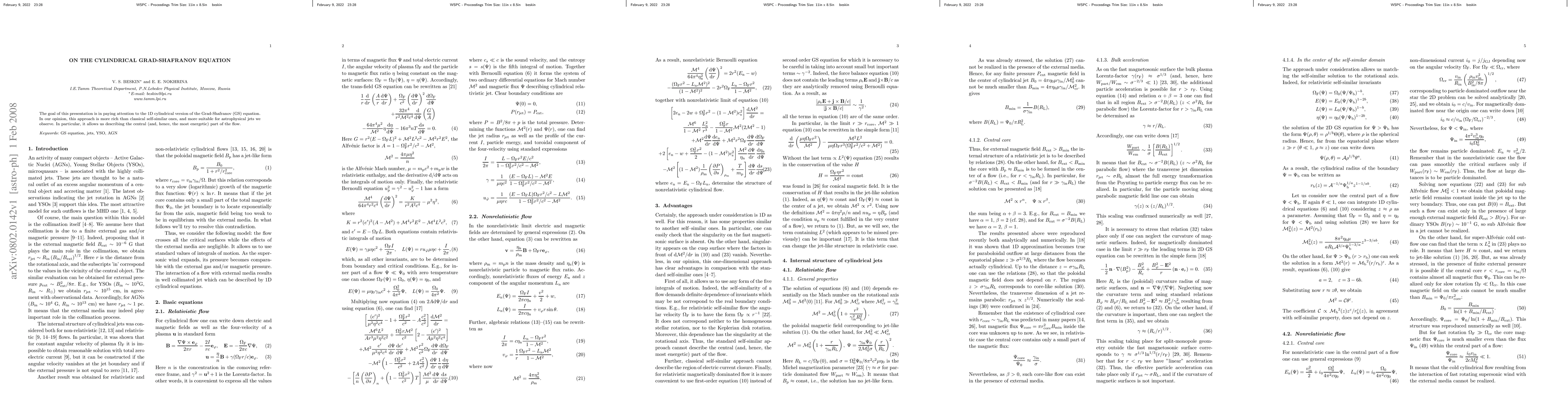 The goal of this presentation is in paying attention to the 1D cylindrical version of the Grad-Shafranov (GS) equation. In our opinion, this approach is more rich than classical self-similar ones, and more suitable for astrophysical jets we observe. In particular, it allows us describing the central (and, hence, the most energetic) part of the flow.