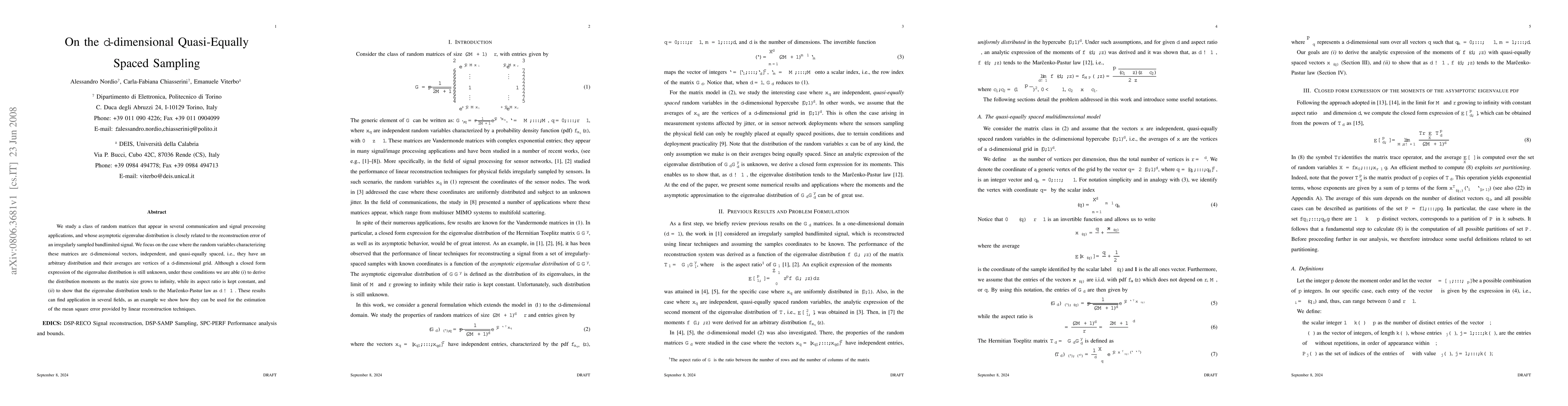 We study a class of random matrices that appear in several communication and signal processing applications, and whose asymptotic eigenvalue distribution is closely related to the reconstruction error of an irregularly sampled bandlimited signal. We focus on the case where the random variables characterizing these matrices are d-dimensional vectors, independent, and quasi-equally spaced, i.e., they have an arbitrary distribution and their averages are vertices of a d-dimensional grid. Although a closed form expression of the eigenvalue distribution is still unknown, under these conditions we are able (i) to derive the distribution moments as the matrix size grows to infinity, while its aspect ratio is kept constant, and (ii) to show that the eigenvalue distribution tends to the Marcenko-Pastur law as d->infinity. These results can find application in several fields, as an example we show how they can be used for the estimation of the mean square error provided by linear reconstruction techniques.