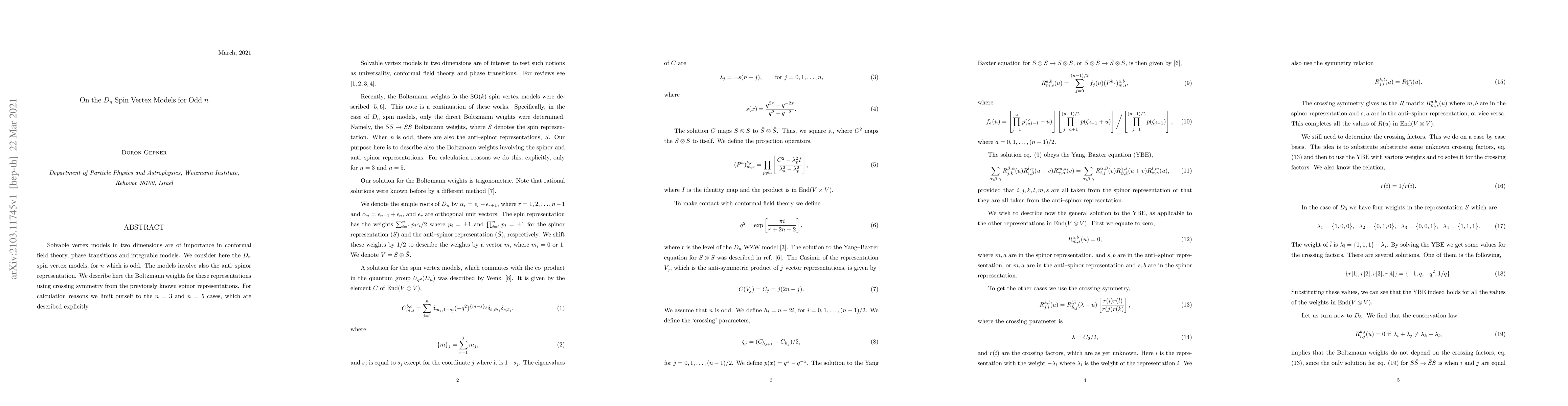 This paper explores solvable $D_n$ spin vertex models for odd $n$, focusing on the $n=3$ and $n=5$ cases. It derives Boltzmann weights for these models using crossing symmetry from known spinor representations, emphasizing their relevance in conformal field theory and integrable models.