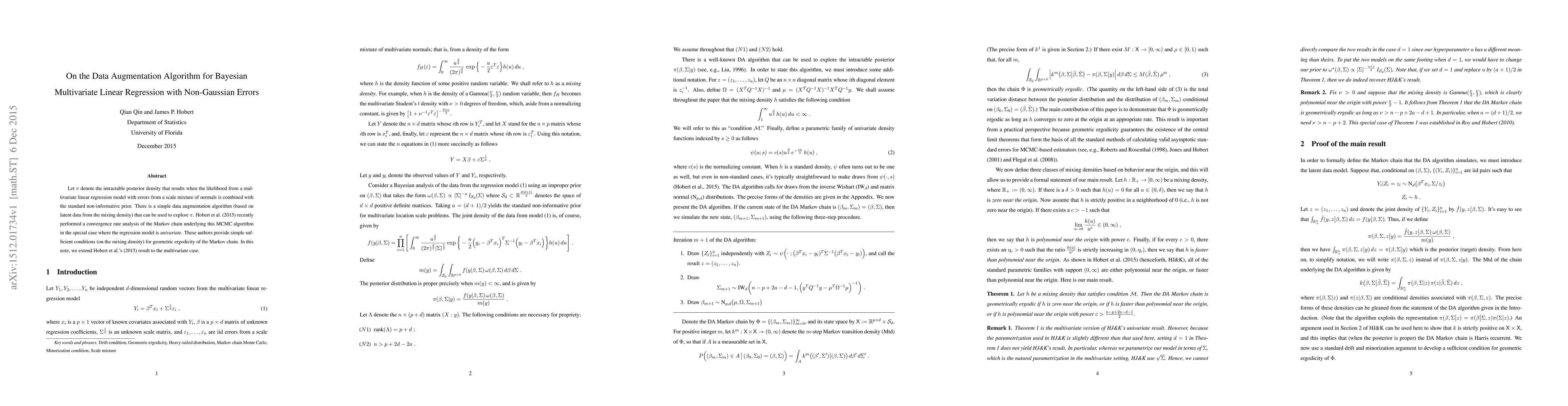 Let $\pi$ denote the intractable posterior density that results when the likelihood from a multivariate linear regression model with errors from a scale mixture of normals is combined with the standard non-informative prior. There is a simple data augmentation algorithm (based on latent data from the mixing density) that can be used to explore $\pi$. Hobert et al. (2015) [arXiv:1506.03113v1] recently performed a convergence rate analysis of the Markov chain underlying this MCMC algorithm in the special case where the regression model is univariate. These authors provide simple sufficient conditions (on the mixing density) for geometric ergodicity of the Markov chain. In this note, we extend Hobert et al.'s (2015) result to the multivariate case.