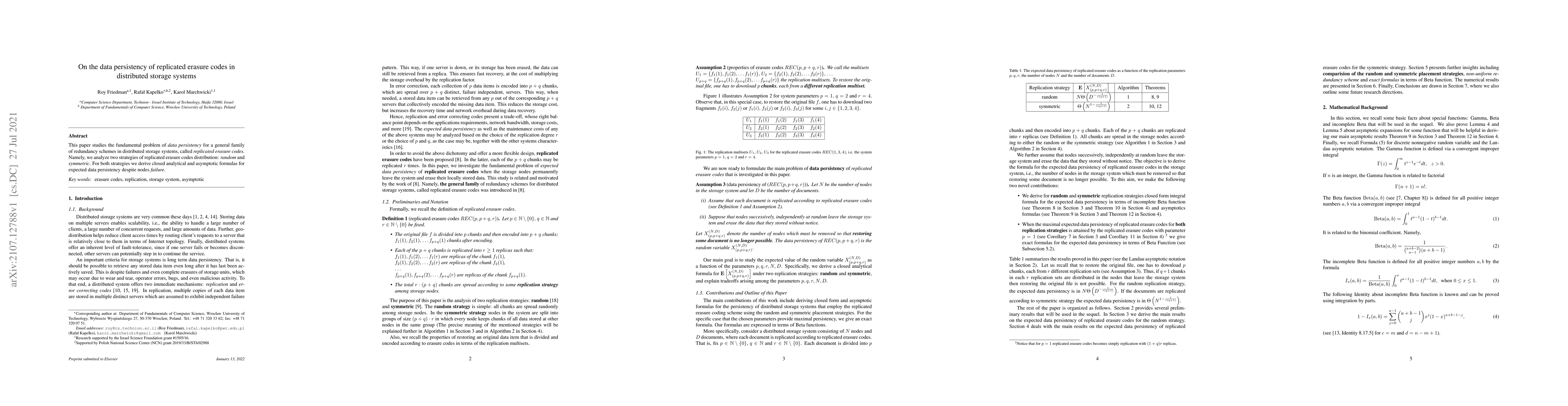 This paper investigates data persistency in distributed storage systems using replicated erasure codes, analyzing random and symmetric distribution strategies. It derives analytical and asymptotic formulas for expected data persistency under node failures.