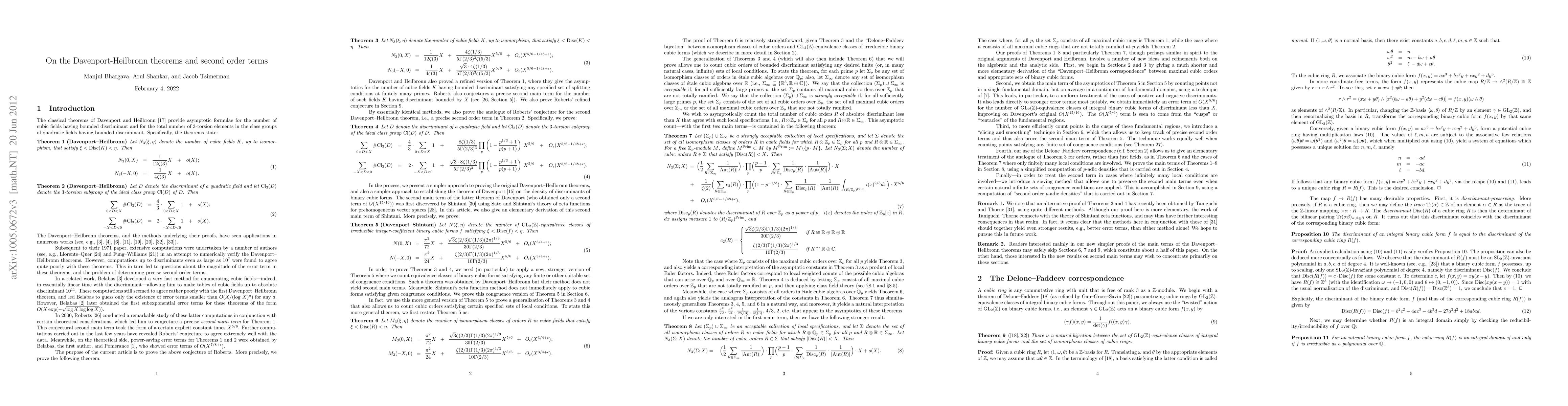This paper provides simple proofs of the Davenport-Heilbronn theorems regarding the asymptotics of cubic fields and quadratic fields, and establishes the second main terms, confirming Roberts' conjecture by interpreting constants in terms of local masses of cubic rings.