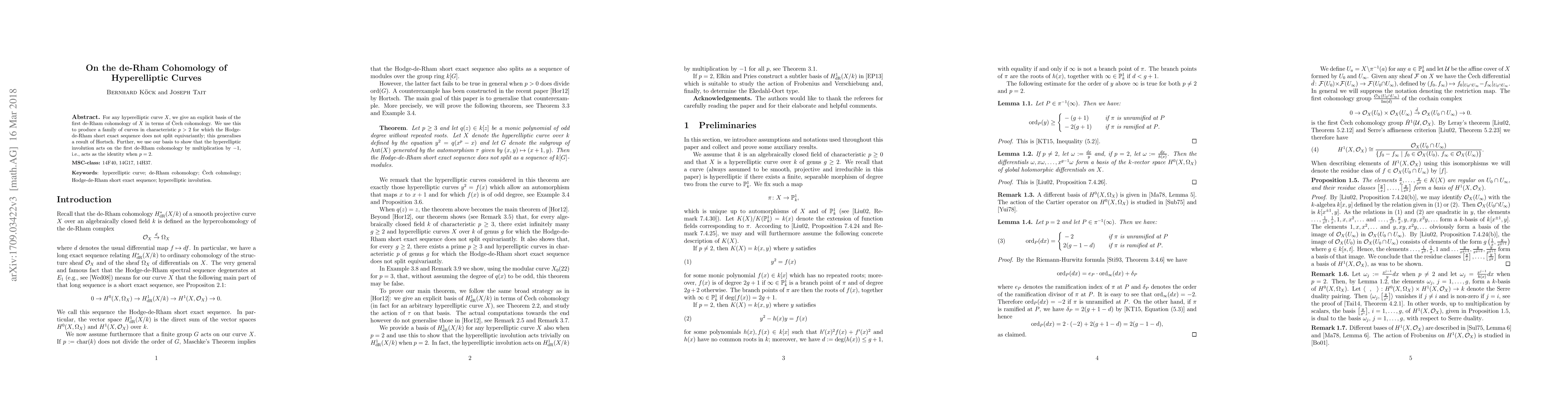 This paper provides an explicit basis for the first de-Rham cohomology of hyperelliptic curves using \v{C}ech cohomology. It also demonstrates a family of curves in characteristic p>2 where the Hodge-de-Rham sequence does not split equivariantly, generalizing Hortsch's result, and shows that the hyperelliptic involution inverts the first de-Rham cohomology, acting as the identity when p=2.
