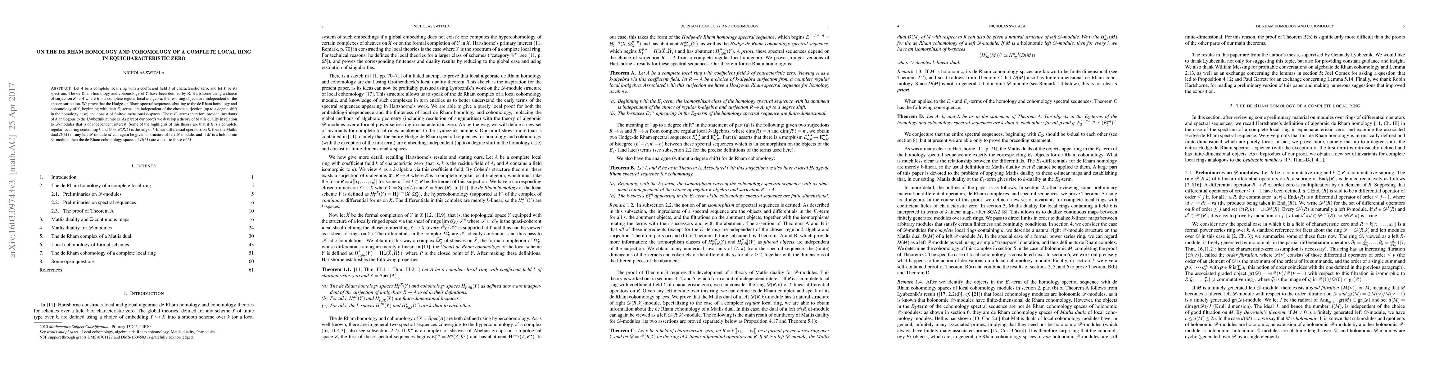 This paper establishes that the Hodge-de Rham spectral sequences for de Rham homology and cohomology of a complete local ring in equicharacteristic zero are independent of the chosen surjection and consist of finite-dimensional vector spaces. It also develops a Matlis duality theory for $\mathcal{D}$-modules that preserves module structures and duality in de Rham cohomology.