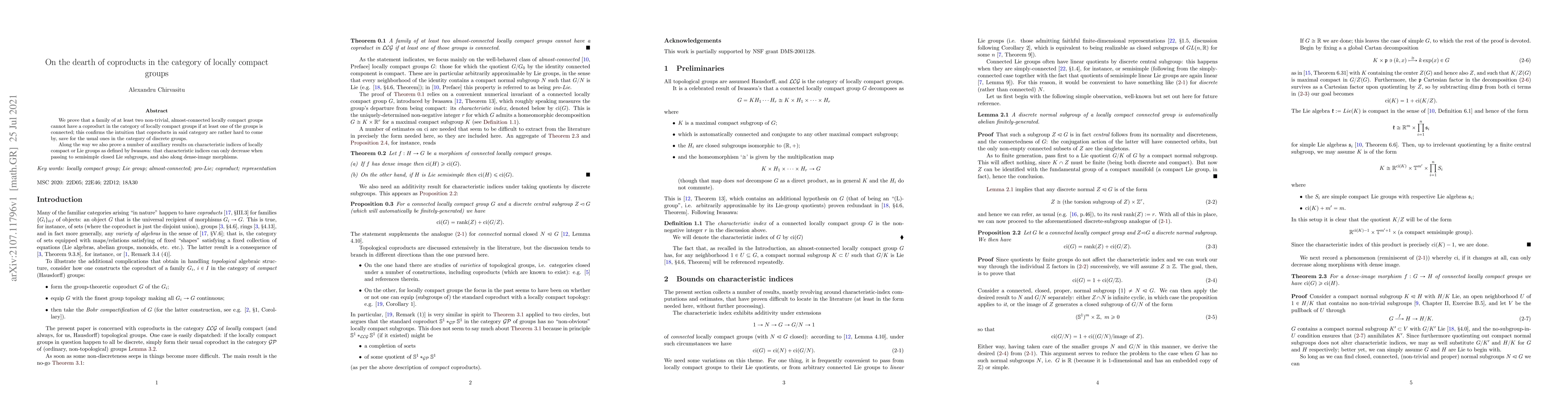 We prove that a family of at least two non-trivial, almost-connected locally compact groups cannot have a coproduct in the category of locally compact groups if at least one of the groups is connected; this confirms the intuition that coproducts in said category are rather hard to come by, save for the usual ones in the category of discrete groups. Along the way we also prove a number of auxiliary results on characteristic indices of locally compact or Lie groups as defined by Iwasawa: that characteristic indices can only decrease when passing to semisimple closed Lie subgroups, and also along dense-image morphisms.