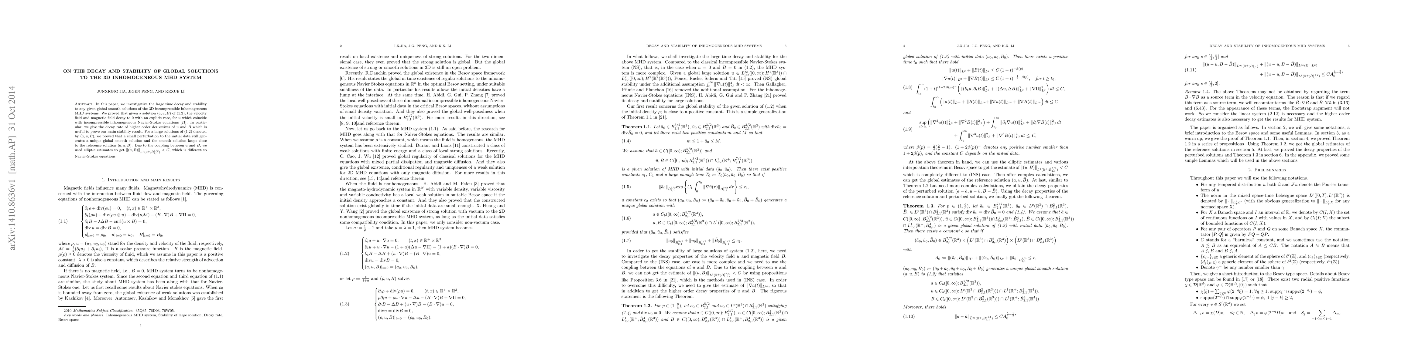 In this paper, we investigative the large time decay and stability to any given global smooth solutions of the $3$D incompressible inhomogeneous MHD systems. We proved that given a solution $(a, u, B)$ of (\ref{mhd_a}), the velocity field and magnetic field decay to $0$ with an explicit rate, for $u$ which coincide with incompressible inhomogeneous Navier-Stokes equations \cite{zhangping}. In particular, we give the decay rate of higher order derivatives of $u$ and $B$ which is useful to prove our main stability result. For a large solutions of (\ref{mhd_a}) denoted by $(a, u, B)$, we proved that a small perturbation to the initial data still generates a unique global smooth solution and the smooth solution keeps close to the reference solution $(a, u, B)$. Due to the coupling between $u$ and $B$, we used elliptic estimates to get $\|(u, B)\|_{L^{1}(\mathbb{R}^{+};\dot{B}_{2,1}^{5/2})} < C$, which is different to Navier-Stokes equations.