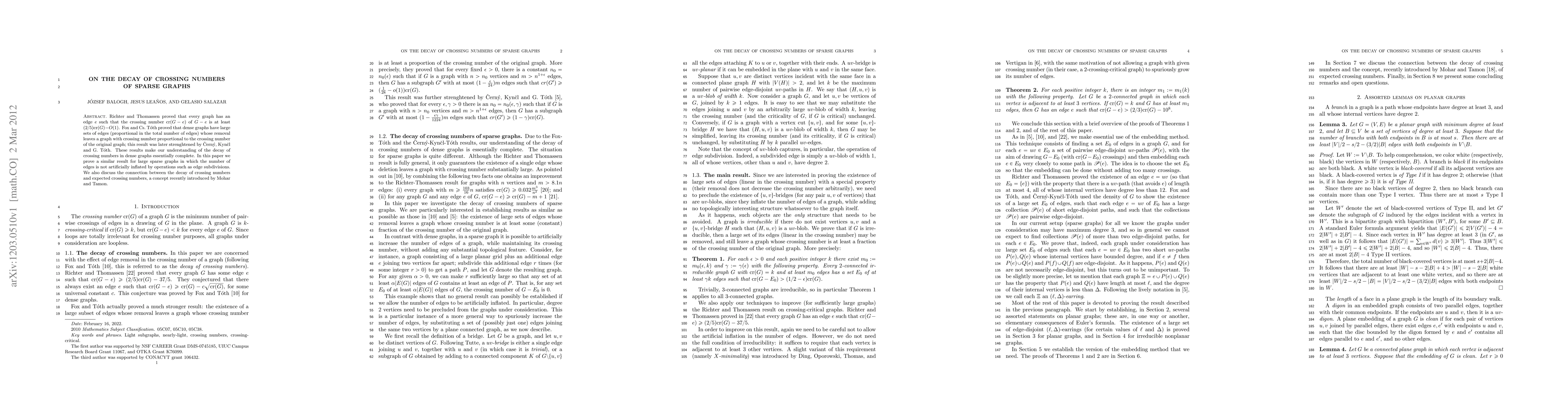 Richter and Thomassen proved that every graph has an edge $e$ such that the crossing number $\ucr(G-e)$ of $G-e$ is at least $(2/5)\ucr(G) - O(1)$. Fox and Cs. T\'oth proved that dense graphs have large sets of edges (proportional in the total number of edges) whose removal leaves a graph with crossing number proportional to the crossing number of the original graph; this result was later strenghtened by \v{C}ern\'{y}, Kyn\v{c}l and G. T\'oth. These results make our understanding of the {decay} of crossing numbers in dense graphs essentially complete. In this paper we prove a similar result for large sparse graphs in which the number of edges is not artificially inflated by operations such as edge subdivisions. We also discuss the connection between the decay of crossing numbers and expected crossing numbers, a concept recently introduced by Mohar and Tamon.
