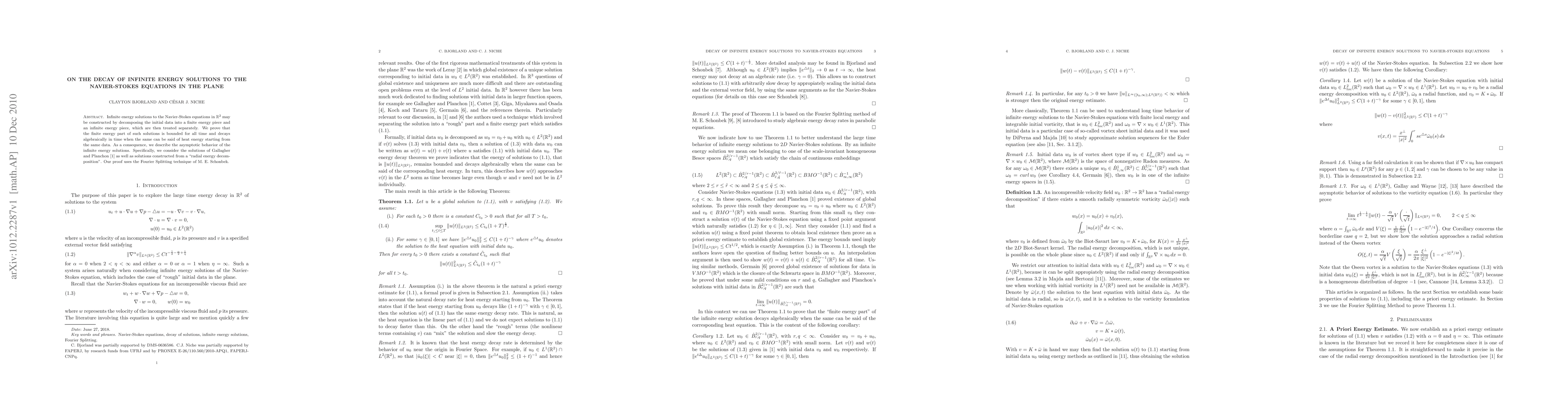 This paper investigates the decay of infinite energy solutions to the Navier-Stokes equations in $\mathbb{R}^2$ by decomposing initial data into finite and infinite energy components. It proves that the finite energy part decays algebraically over time, leading to a description of the asymptotic behavior of the infinite energy solutions.
