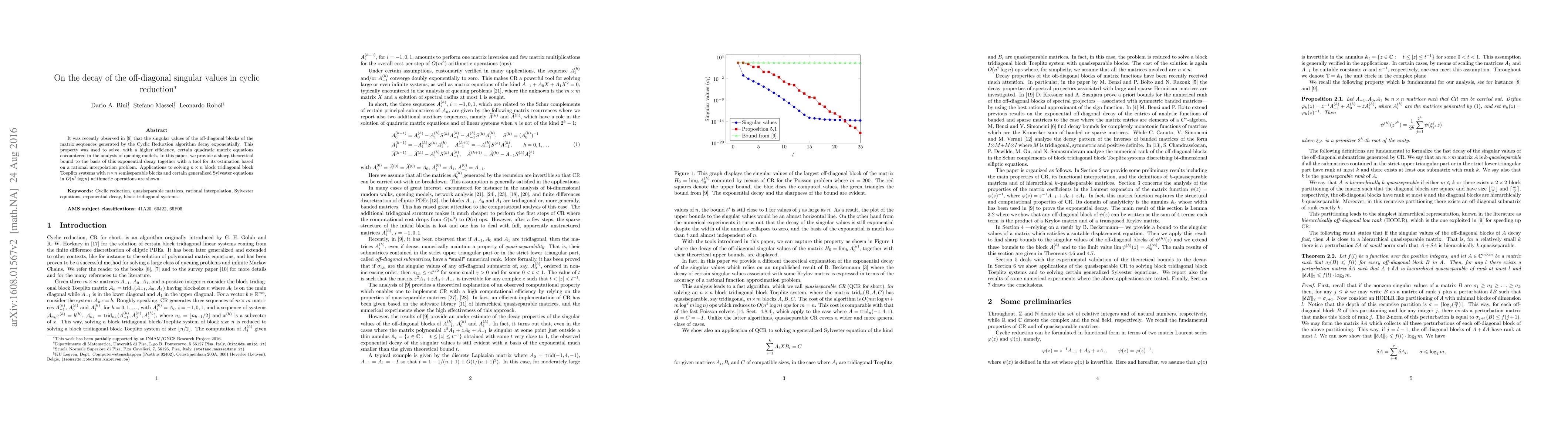 This paper establishes a theoretical bound for the exponential decay of off-diagonal singular values in cyclic reduction matrices, providing a tool for estimation based on rational interpolation. It demonstrates applications in solving large block tridiagonal systems and generalized Sylvester equations efficiently.