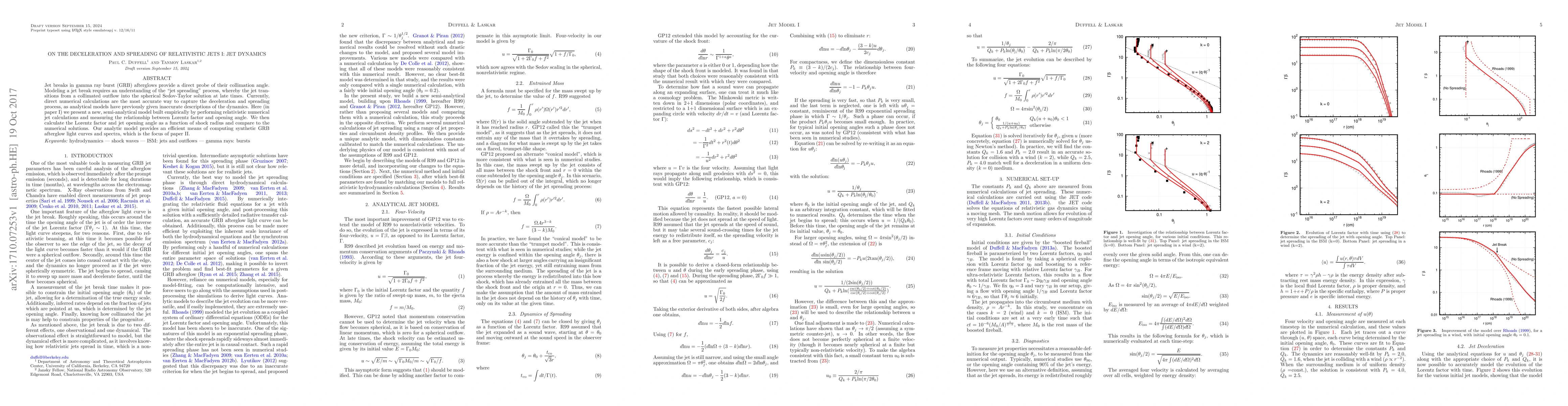 Jet breaks in gamma ray burst (GRB) afterglows provide a direct probe of their collimation angle. Modeling a jet break requires an understanding of the "jet spreading" process, whereby the jet transitions from a collimated outflow into the spherical Sedov-Taylor solution at late times. Currently, direct numerical calculations are the most accurate way to capture the deceleration and spreading process, as analytical models have previously given inaccurate descriptions of the dynamics. Here (in paper I) we present a new, semi-analytical model built empirically by performing relativistic numerical jet calculations and measuring the relationship between Lorentz factor and opening angle. We then calculate the Lorentz factor and jet opening angle as a function of shock radius and compare to the numerical solutions. Our analytic model provides an efficient means of computing synthetic GRB afterglow light curves and spectra, which is the focus of paper II.